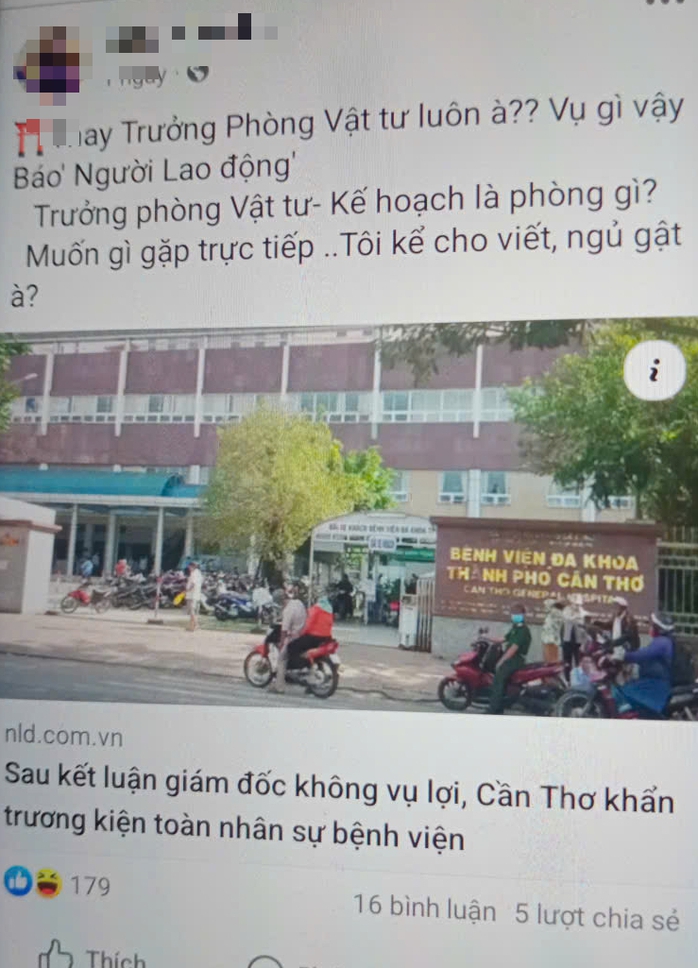 Hai ngày qua, một tài khoản Facebook có tên là "D.H.L" đã chia sẻ bài viết "Sau kết luận giám đốc không vụ lợi, Cần Thơ khẩn trương kiện toàn nhân sự bệnh viện" đăng trên Báo Người Lao Động điện tử ngày 18-10.