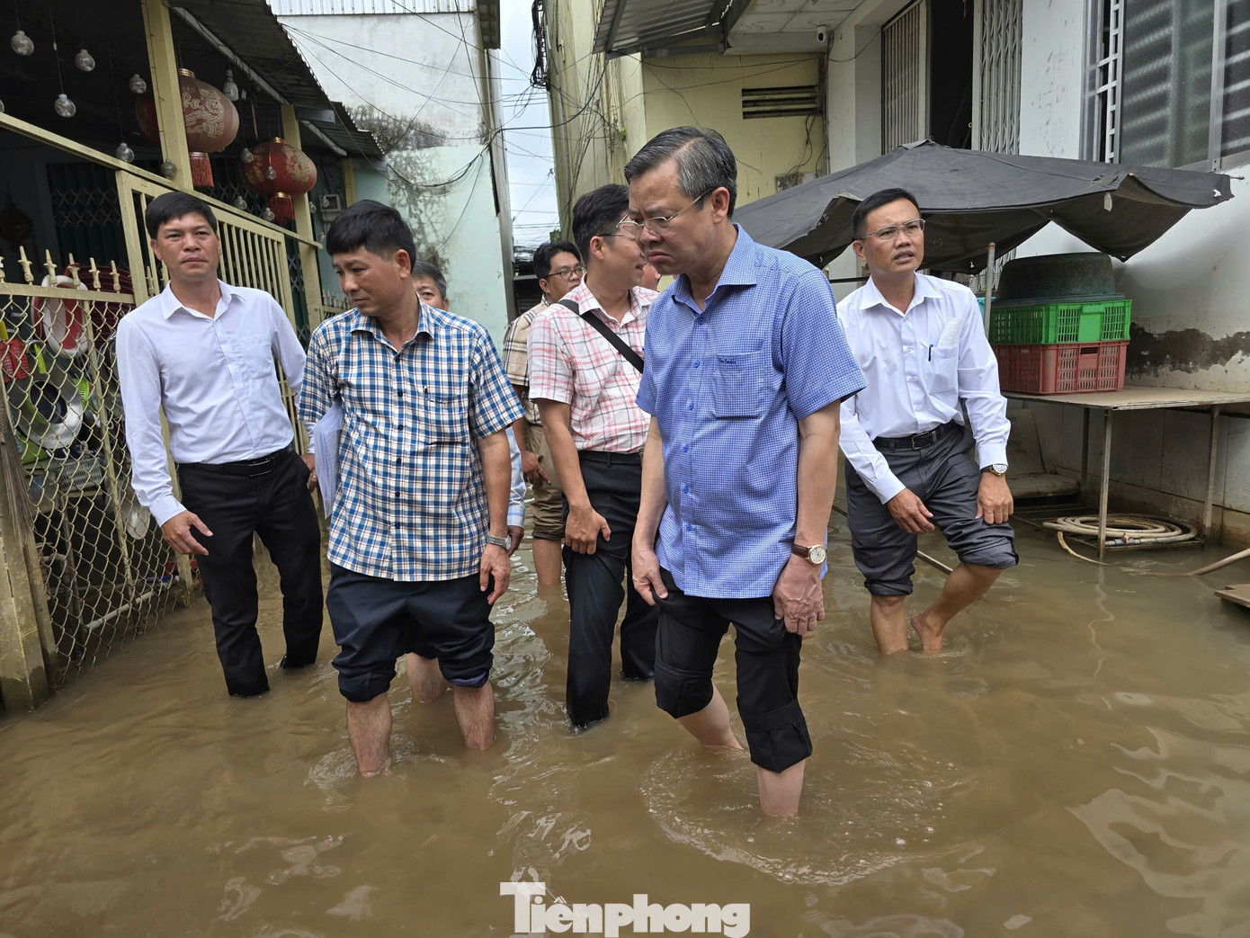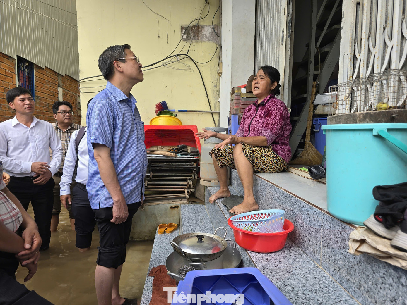 Sáng 10/11, do đang trong giờ triều cường, một số vị trí đường và nhà dân gần cầu Bình Thủy còn ngập, đoàn lãnh đạo Cần Thơ lội nước vào thăm hỏi người dân phải nhường đất cho dự án.