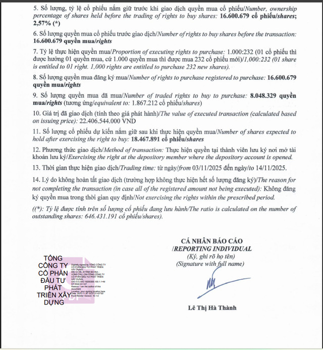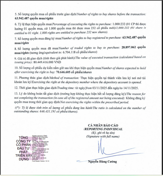 Cụ thể, trong thời gian 3-14/11/2025, Chủ tịch HĐQT NguyễnHùng Cường chỉ thực hiện 28,89 triệu trong tổng số 63,94 triệu quyền mua, tươngđương mua vào 6,7 triệu cổ phiếu chào bán thêm của DIG. Lý do không hoàn tấtgiao dịch là vì không đăng ký quyền mua trong thời gian quy định.