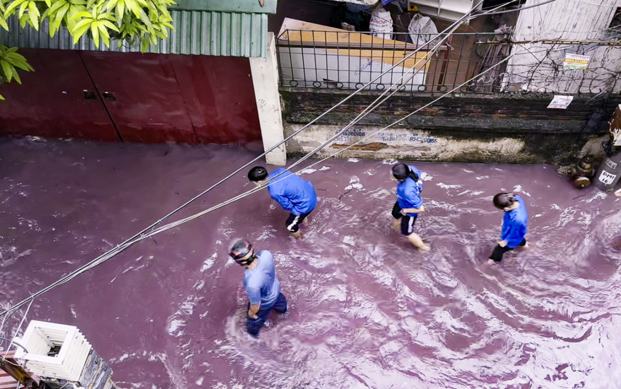 Theo đó, vào chiều 16/9, dòng nước có màu đỏ dâng lên, tràn vào khu dân cư tại phố Phú Minh (phường Đông Ngạc, Hà Nội). Theo phản ánh, nước tại đây có màu đỏ lạ, mùi khó chịu. Càng đi vào sâu các hẻm, nước ngập sâu, màu đỏ đậm hơn, một số điểm có váng ở trên bề mặt.
