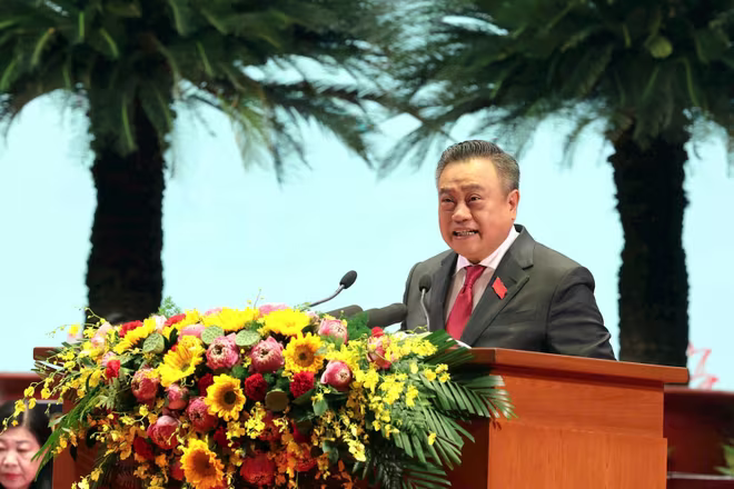 Ủy viên Trung ương Đảng, Phó Bí thư Thành ủy, Chủ tịch UBND TP Hà Nội Trần Sỹ Thanh trình bày Báo cáo kiểm điểm của Ban Chấp hành Đảng bộ thành phố khóa XVII tại Đại hội.