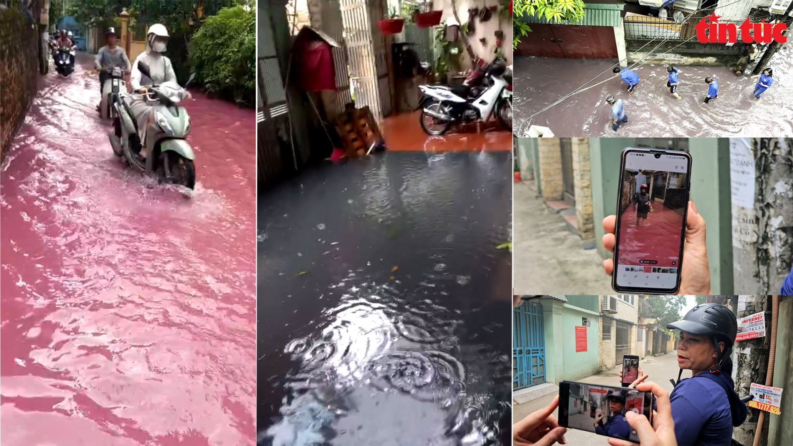 Nước ngập sau mưa đổi màu đen và đỏ bất thường tại khu dân cư gần Cụm công nghiệp Phú Minh.