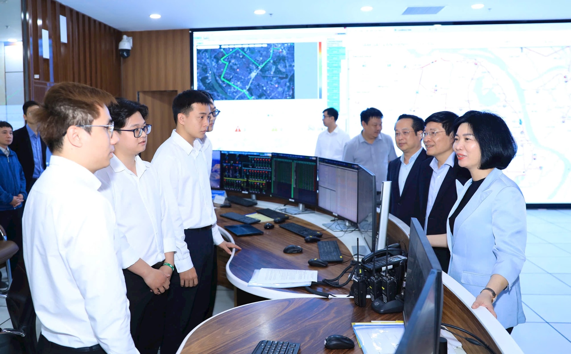 Chủ tịch HĐND thành phố Phùng Thị Hồng Hà động viên, thăm hỏi lực lượng làm nhiệm vụ tại Trung tâm thông tin chỉ huy Công an thành phố. Ảnh: Quang Thái