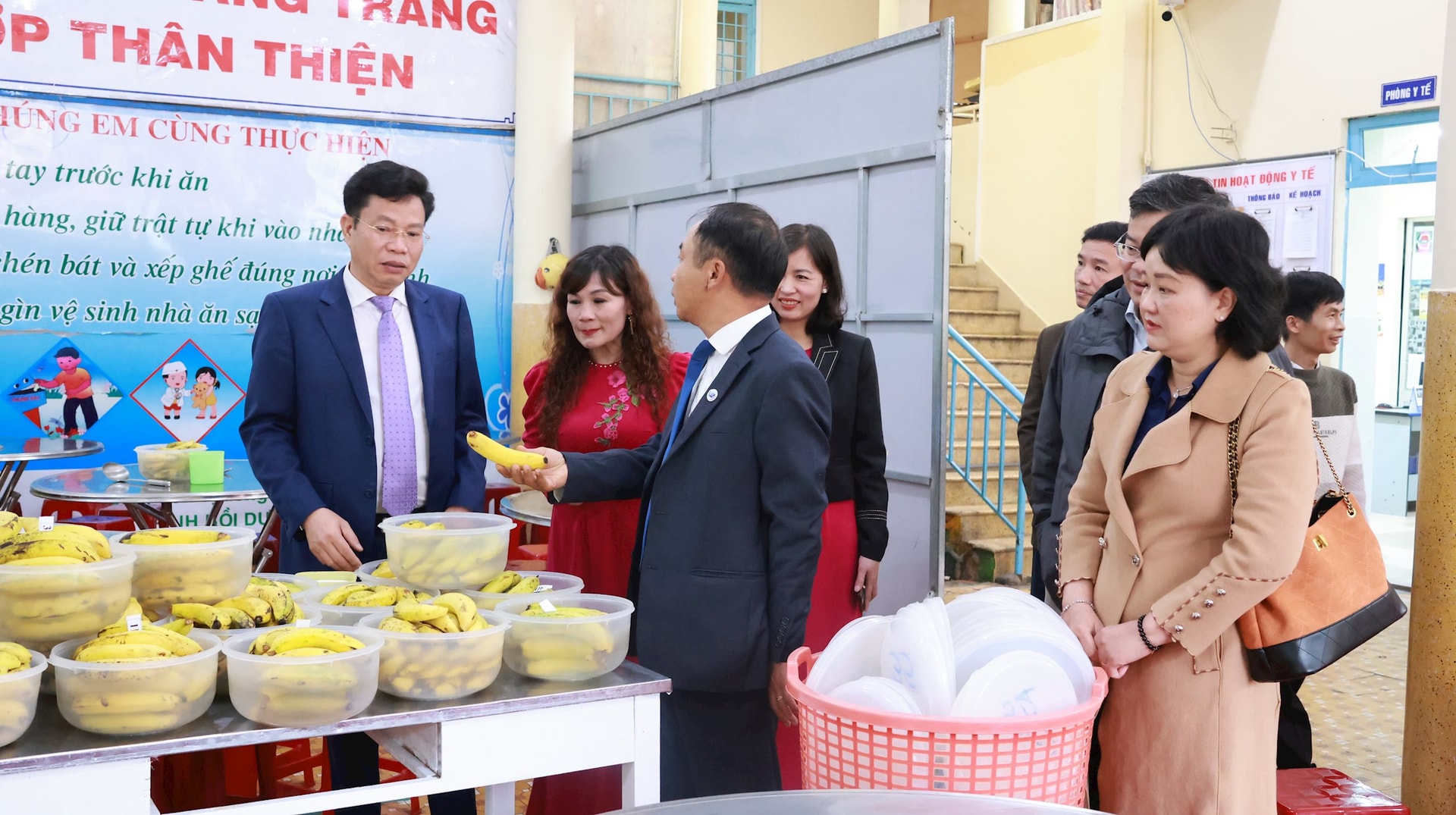 Lãnh đạo tỉnh tham quan bếp ăn bán trú và đề nghị nhà trường đảm bảo chất lượng bữa ăn cho học sinh.