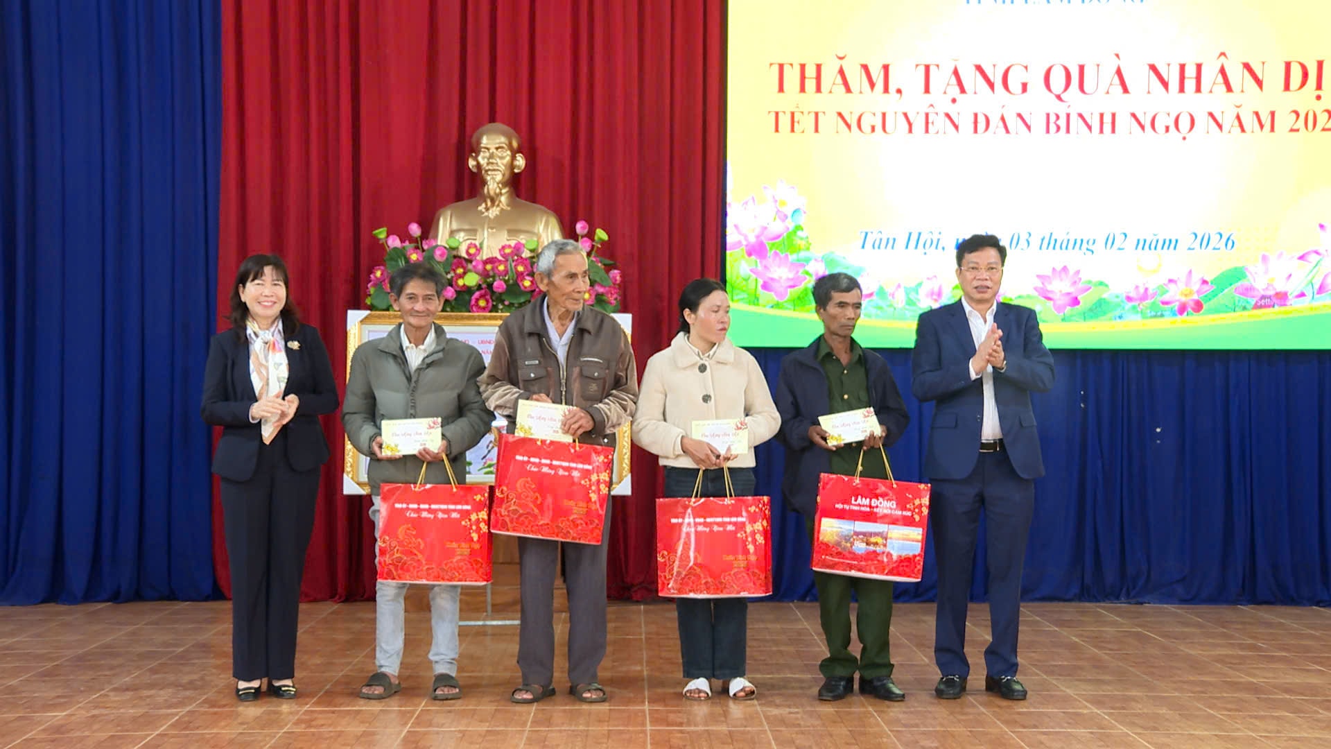 Các đồng chí: Lưu Văn Trung, Phó Bí thư Tỉnh ủy, Chủ tịch HĐND tỉnh Lâm Đồng; Hà Thị Hạnh, Ủy viên Ban Thường vụ Tỉnh ủy, Phó Chủ tịch Ủy ban MTTQ Việt Nam tỉnh tặng quà các gia đình có hoàn cảnh khó khăn tại xã Tân Hội