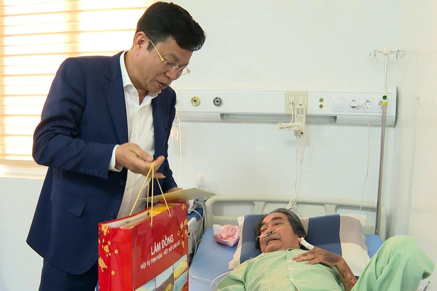 Đồng chí Lưu Văn Trung, Phó Bí thư Tỉnh ủy, Chủ tịch HĐND tỉnh Lâm Đồng thăm hỏi, tặng quà và chúc sức khỏe Anh hùng Lực lượng Vũ trang Nhân dân Mai Thanh Minh, hiện đang được chăm sóc, điều trị tại Bệnh viện Đa khoa tỉnh Lâm Đồng