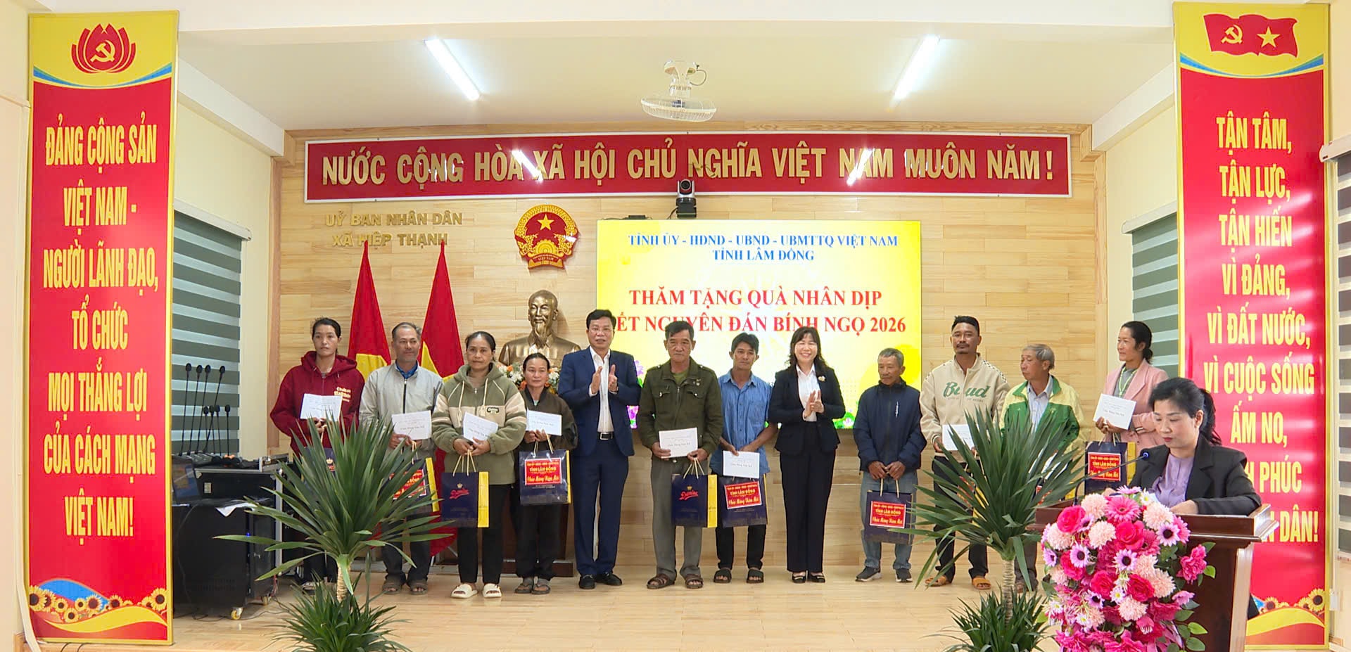 Các đồng chí: Lưu Văn Trung, Phó Bí thư Tỉnh ủy, Chủ tịch HĐND tỉnh Lâm Đồng; Hà Thị Hạnh, Ủy viên Ban Thường vụ Tỉnh ủy, Phó Chủ tịch Ủy ban MTTQ Việt Nam tỉnh tặng quà các gia đình có hoàn cảnh khó khăn tại xã Hiệp Thạnh