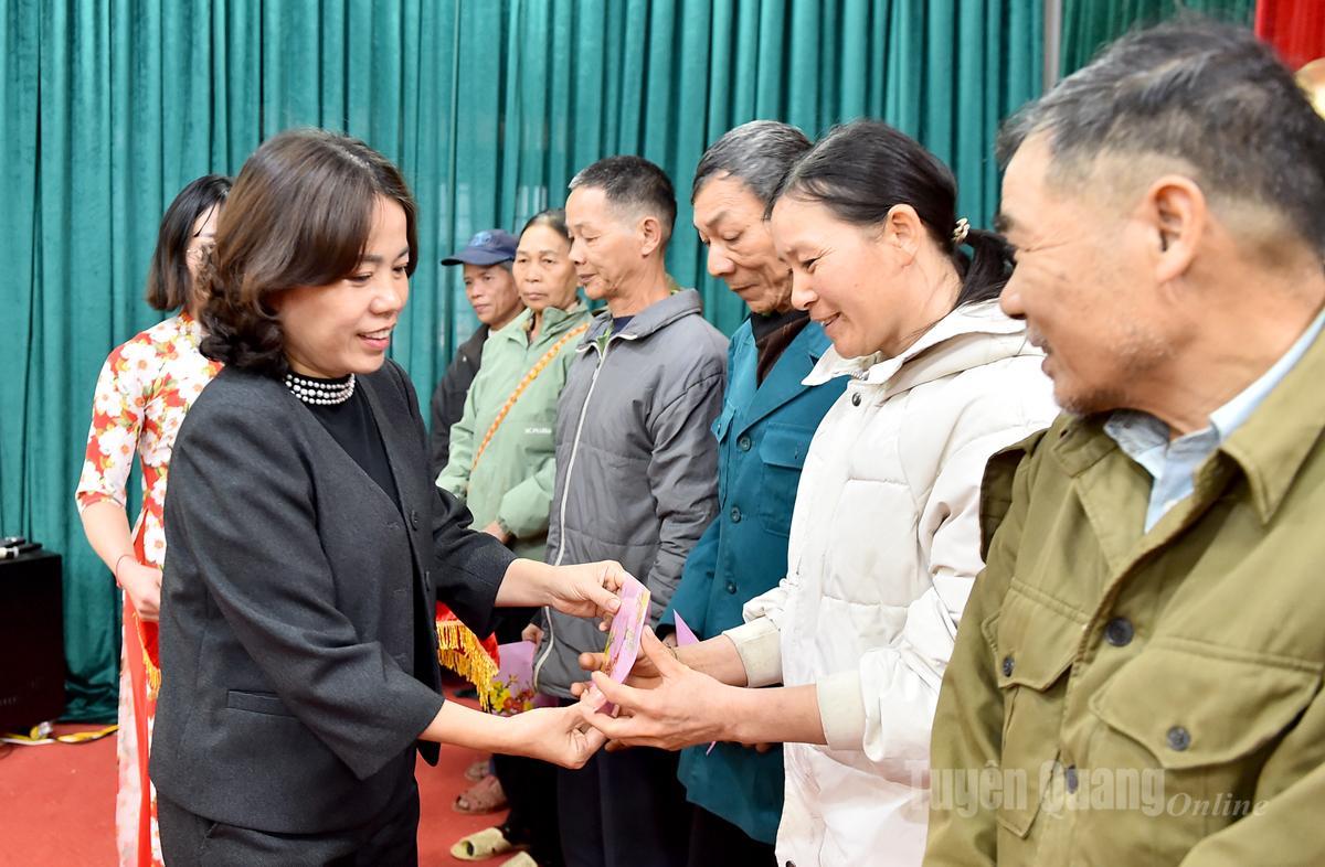 Đồng chí Lý Thị Lan, Trưởng đoàn ĐBQH chuyên trách tỉnh trao quà cho các hộ gia đình chính sách, hộ nghèo xã Côn Lôn.