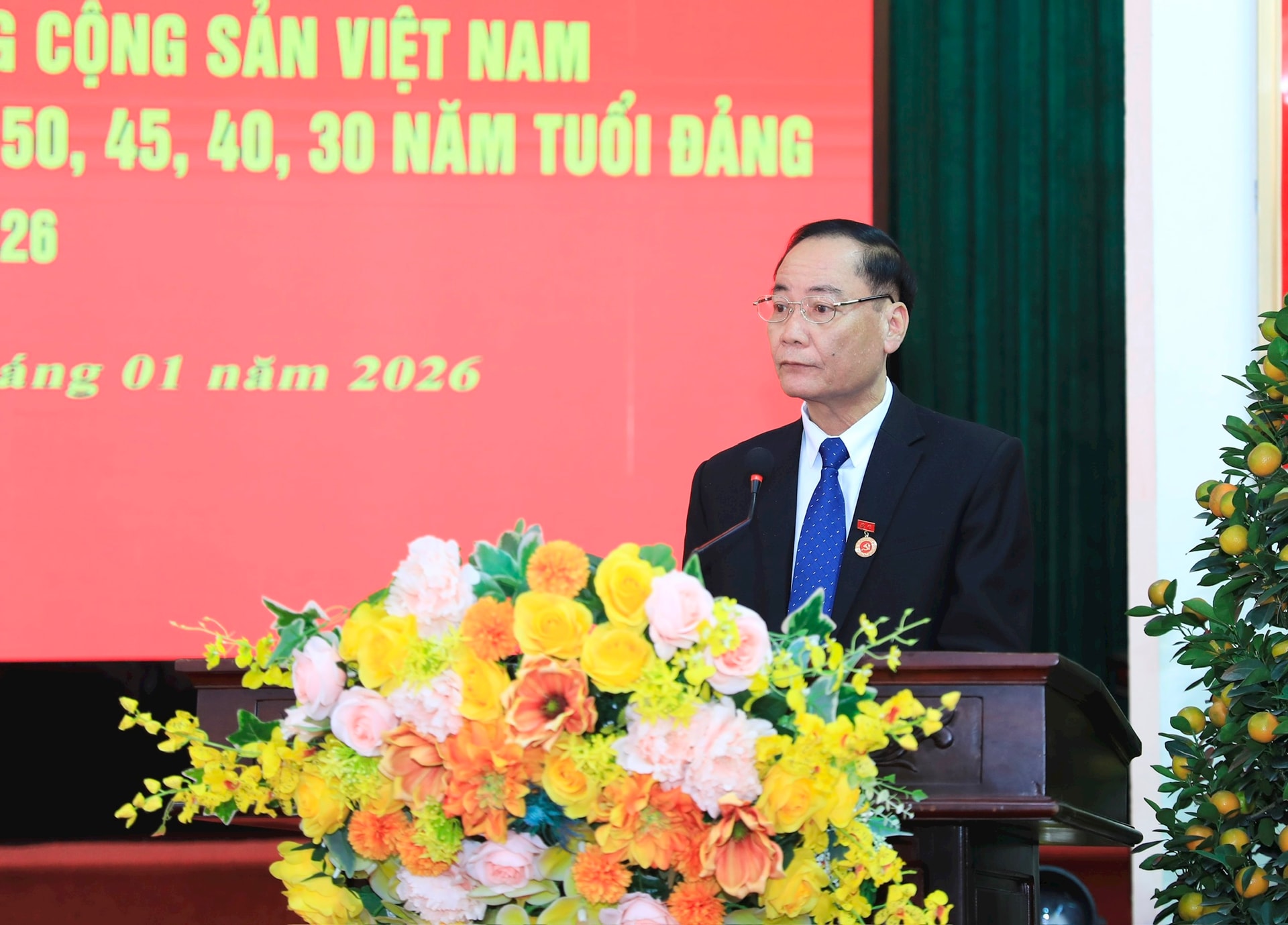 Đồng chí Nguyễn Văn Chí (đại diện các đảng viên nhận Huy hiệu Đảng) phát biểu tại buổi lễ. Ảnh: Quang Thái