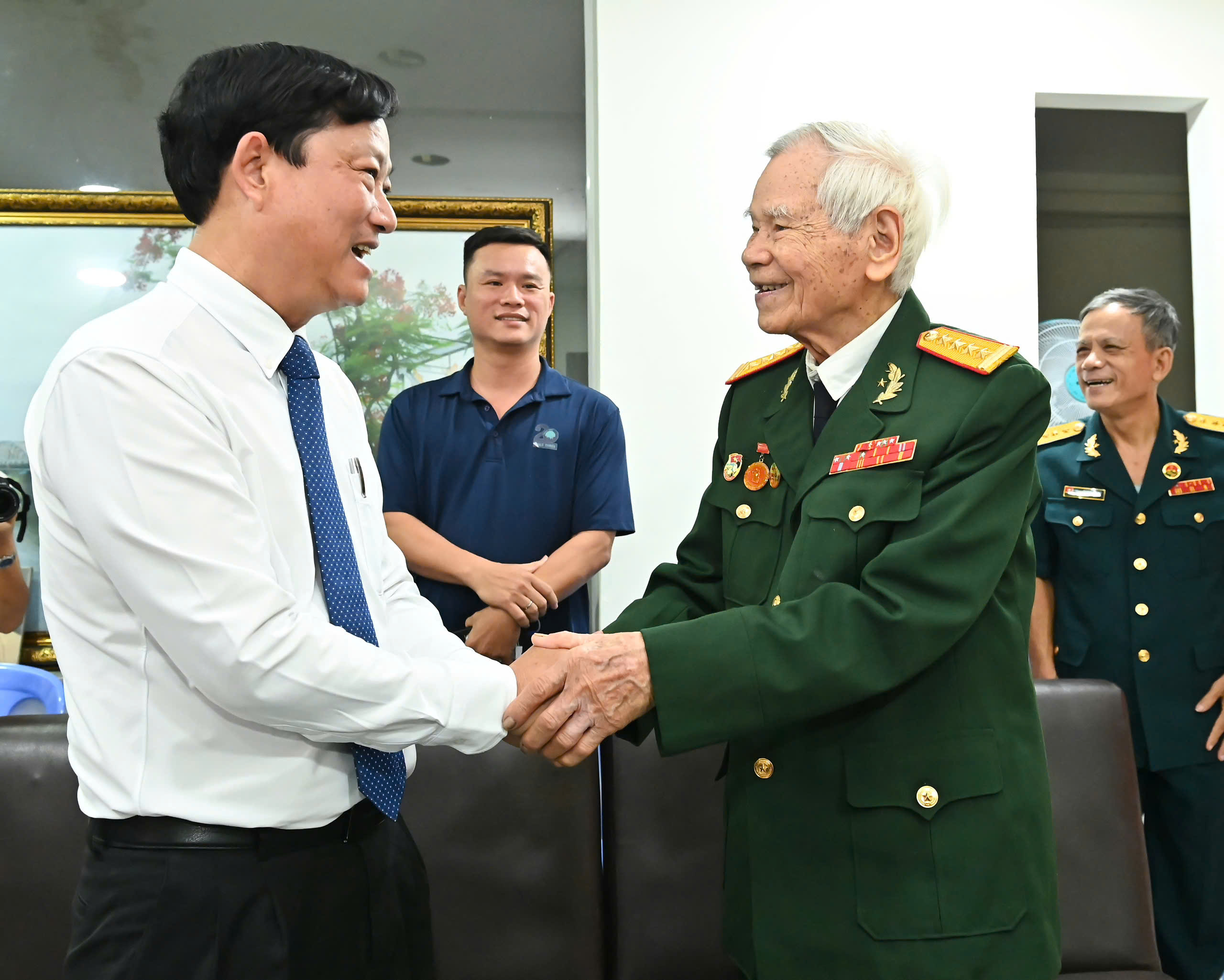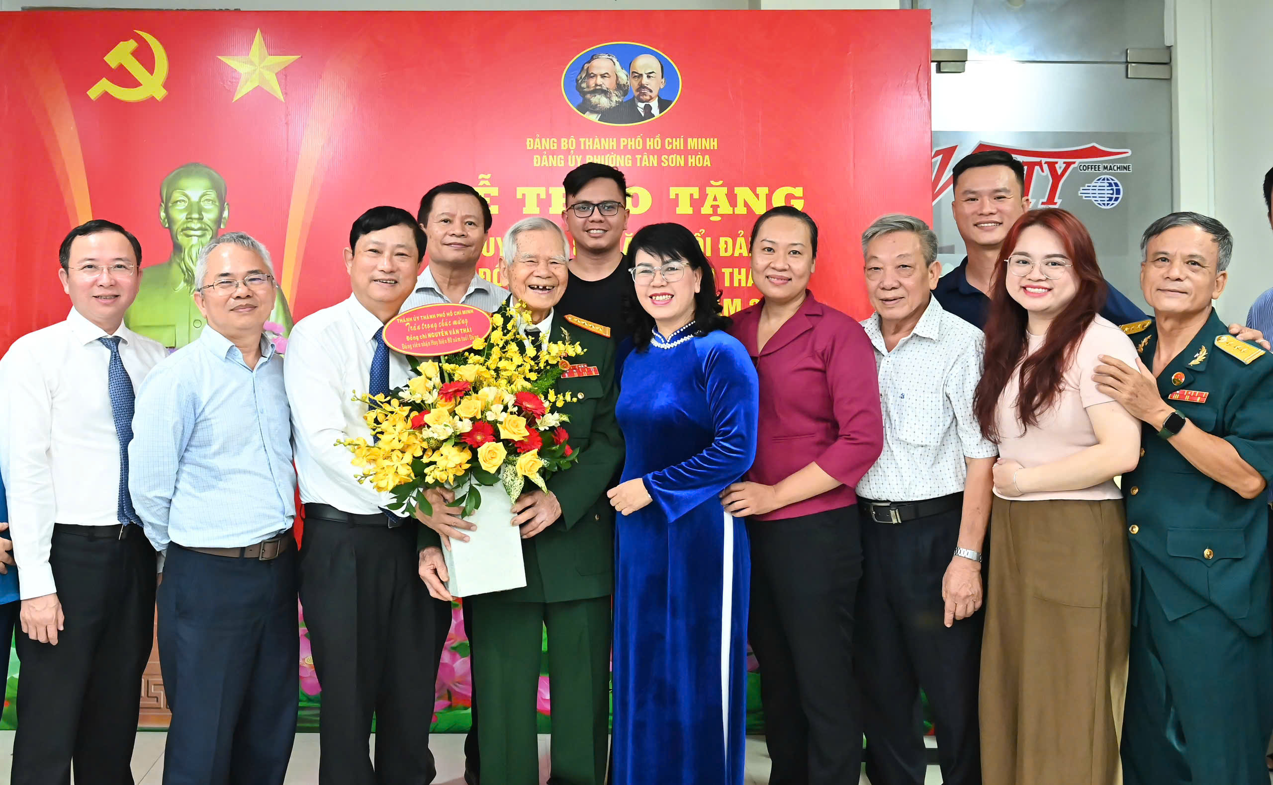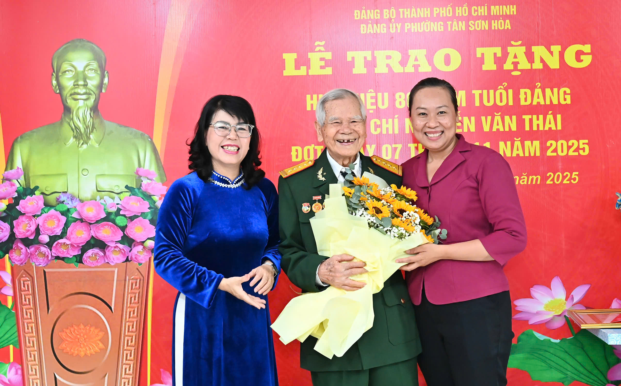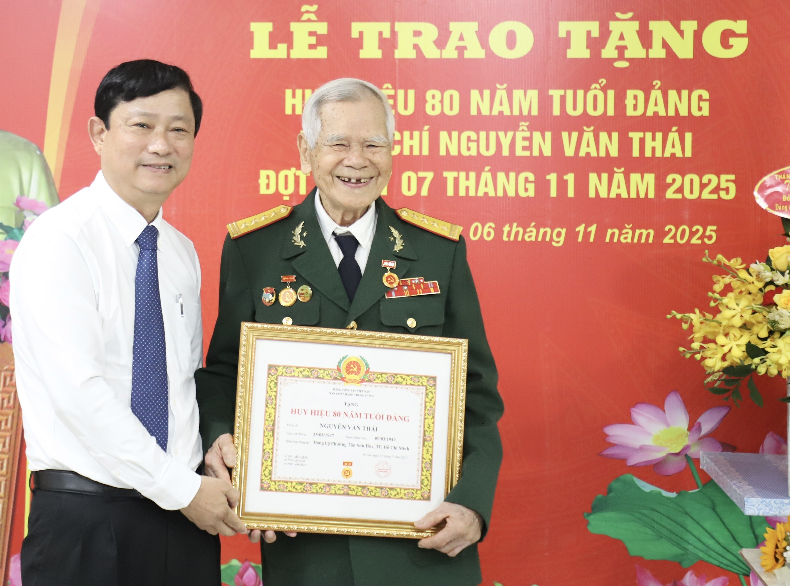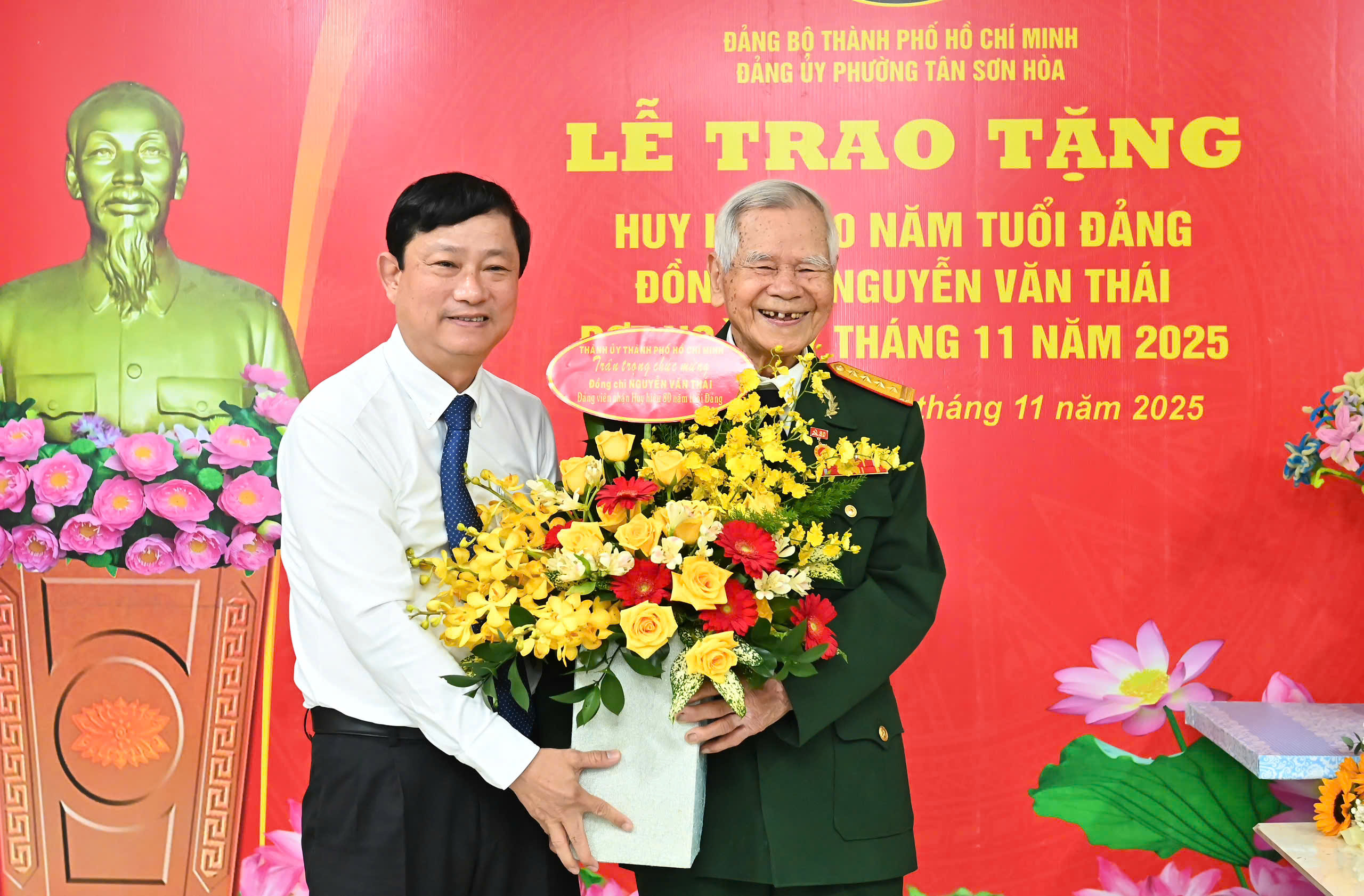 Tại buổi lễ, Chủ tịch HĐND TPHCM Võ Văn Minh trao Huy hiệu 80 năm tuổi Đảng và tặng hoa chúc mừng đồng chí Nguyễn Văn Thái (sinh năm 1928, quê quán TP Huế), nguyên Cục trưởng Cục Tài vụ - Tổng Cục Hậu cần.