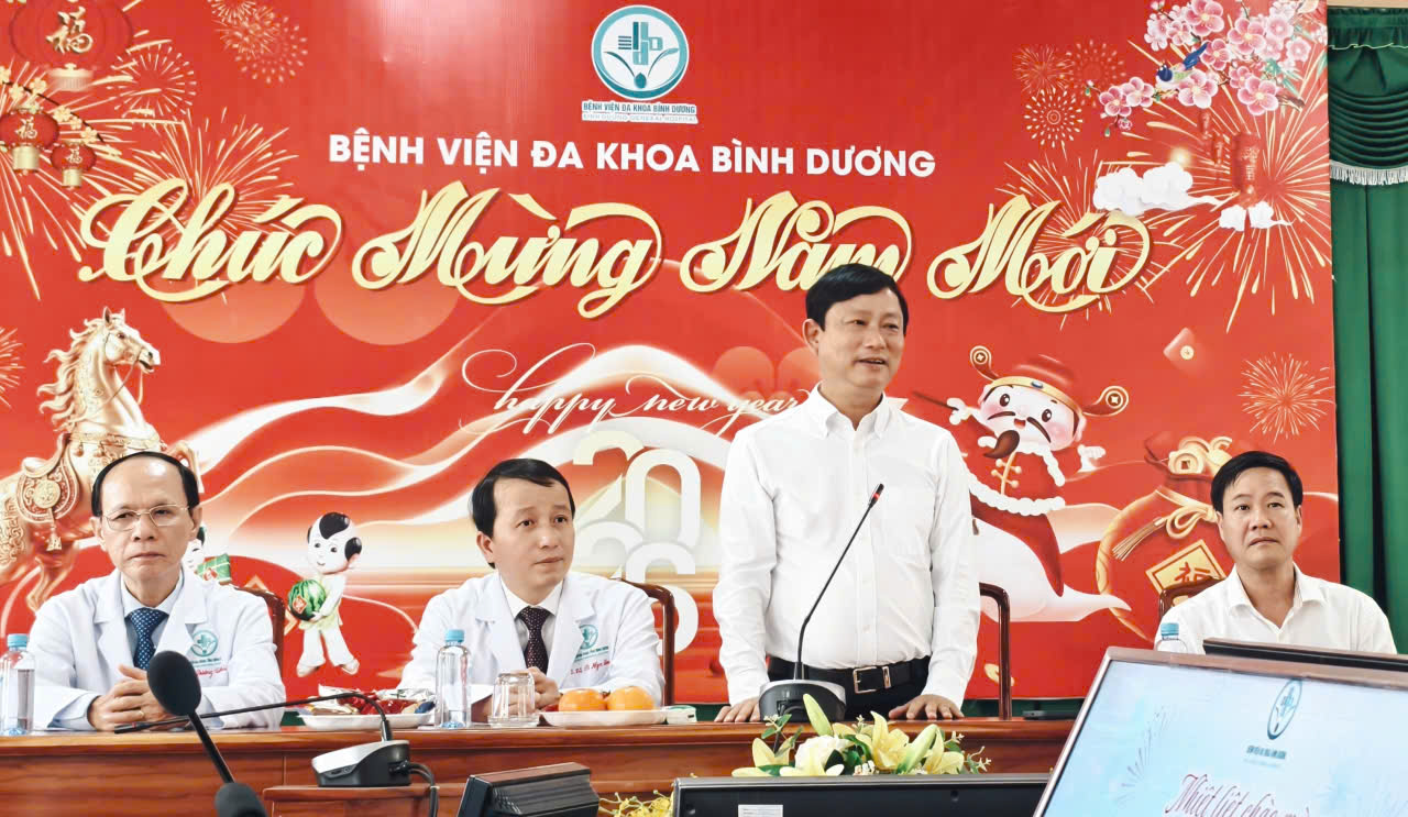 * Tiếp đó, đoàn đến thăm, chúc tết tại Bệnh viện Đa khoa Bình Dương. Đại diện Ban Giám đốc bệnh viện báo cáo tình hình khám, chữa bệnh năm qua, nổi bật là việc ứng dụng nhiều kỹ thuật mới, nâng cao chất lượng điều trị, giảm tải cho tuyến trên.