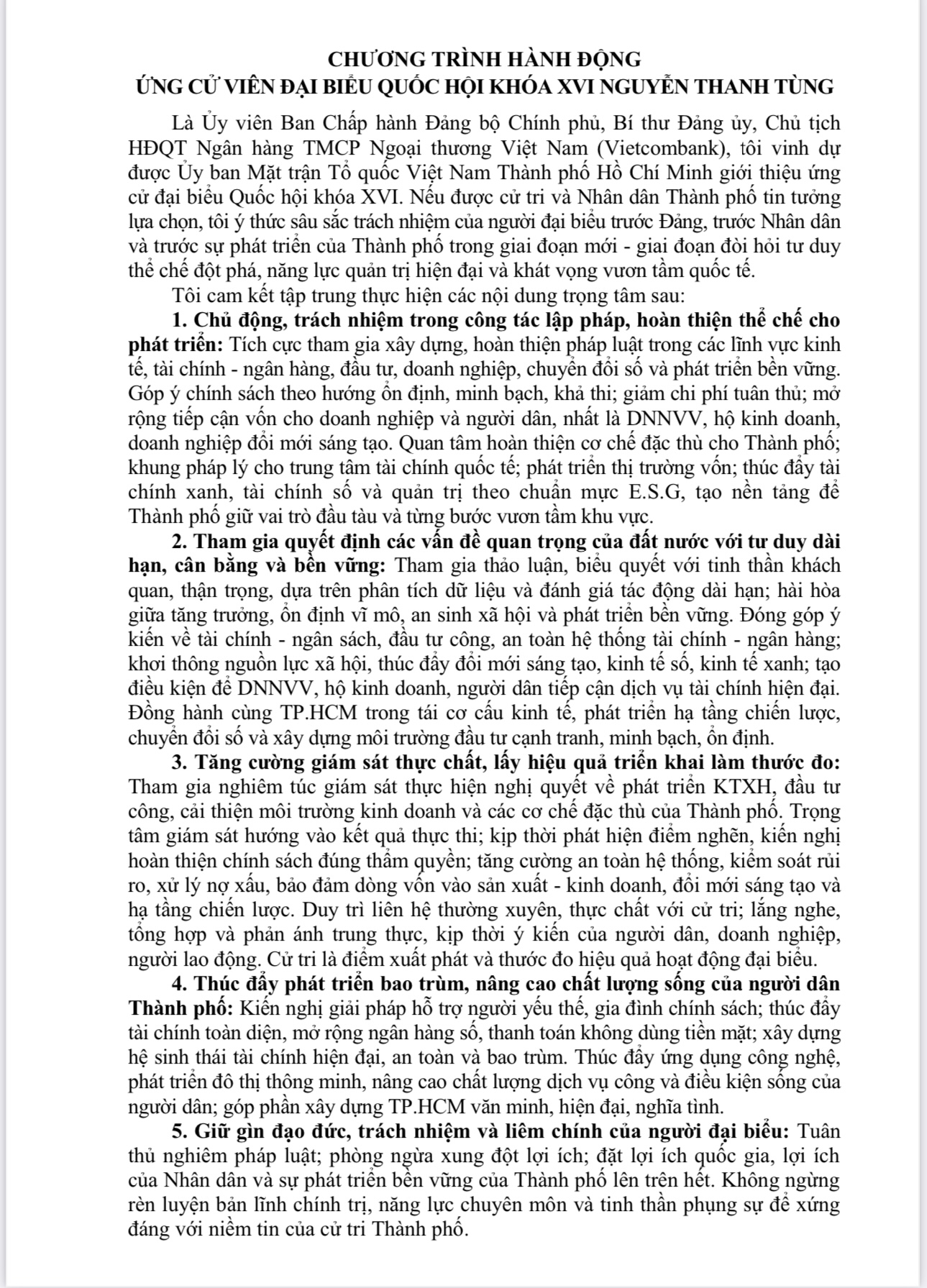 Ông Nguyễn Thanh Tùng, Ủy viên Ban Chấp hành Đảng bộ Chính phủ, Bí thư Đảng ủy, Chủ tịch Hội đồng quản trị Ngân hàng TMCP Ngoại thương Việt Nam (Vietcombank), ứng cử đại biểu Quốc hội khóa XVI, đơn vị bầu cử số 12 TP.HCM.