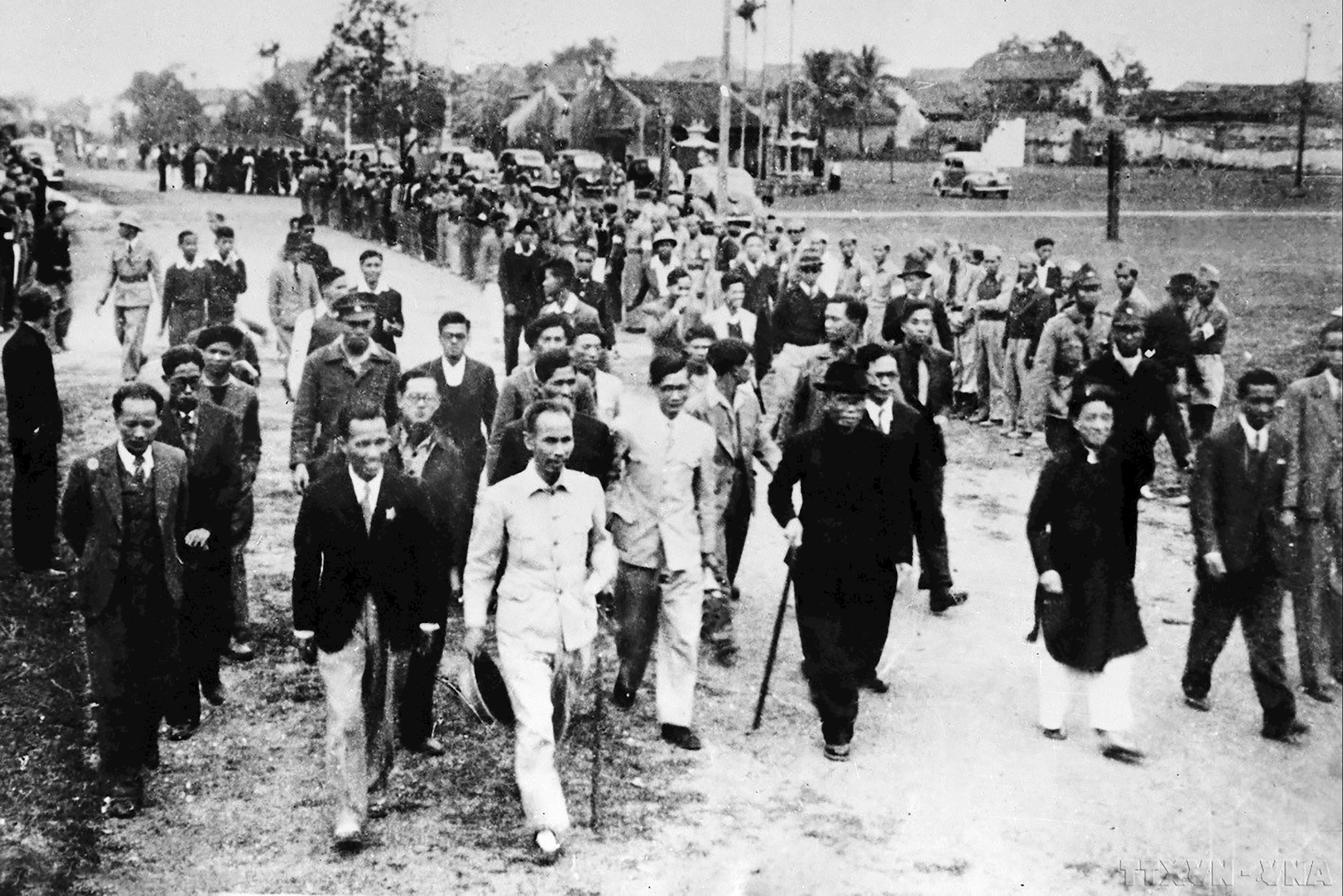 Chủ tịch Hồ Chí Minh tham dự mít tinh của hàng vạn nhân dân Thủ đô chào mừng Người và các đại biểu được giới thiệu ứng cử tại Hà Nội, tại sân vận động Phúc Tân, ngày 5/1/1946. Ảnh tư liệu tại trưng bày