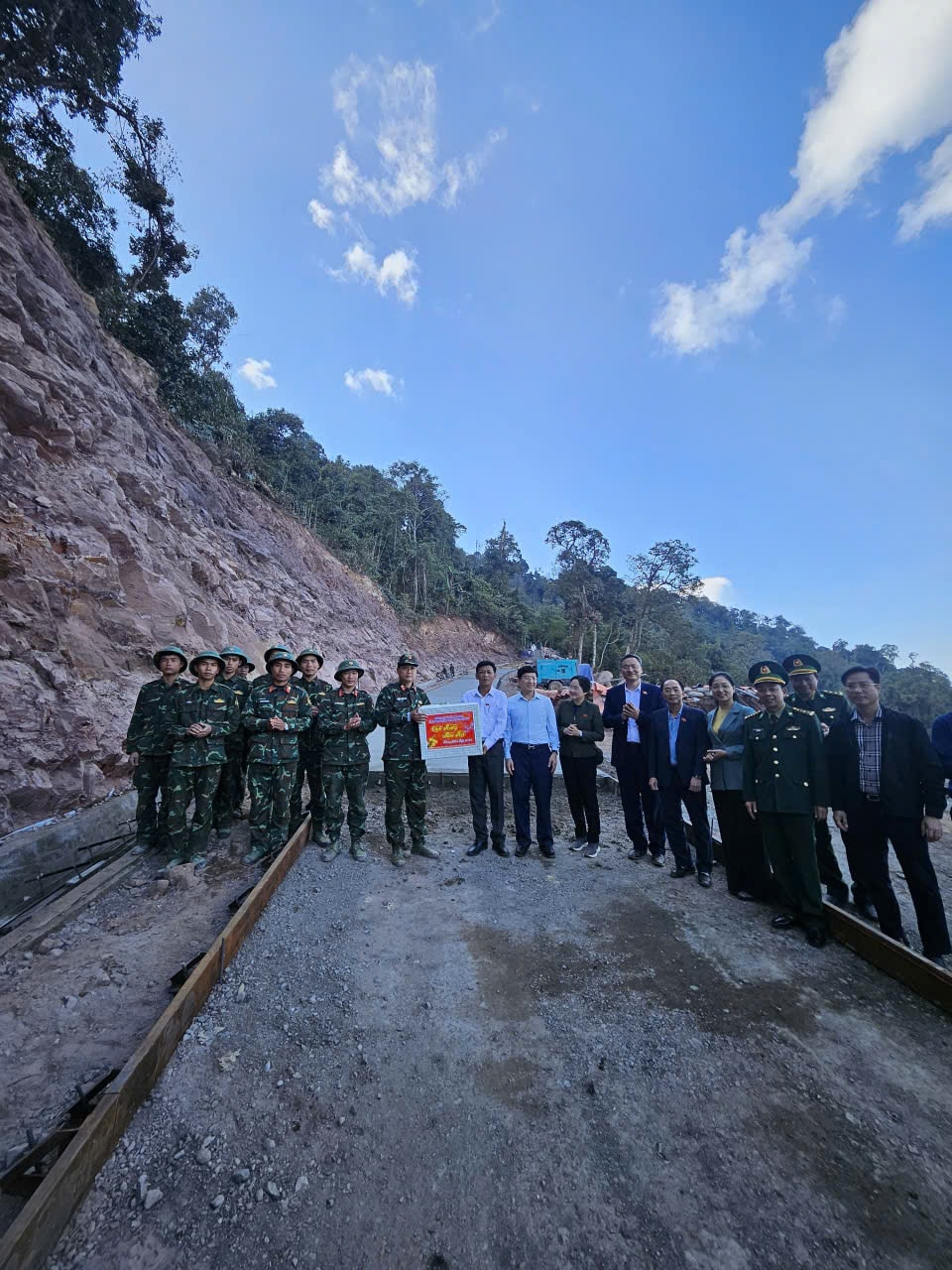 Chủ tịch Hội đồng Dân tộc Lâm Văn Mẫn và Đoàn công tác trao quà động viên các chiến sĩ Lữ công binh 543, Quân khu 2 đang thi công tuyến đường lên cột mốc số 0 tại A Pa Chải