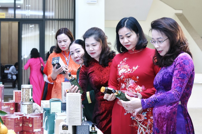 Ủy viên TƯ Đảng, Phó Chủ tịch UBTƯ MTTQ Việt Nam, Chủ tịch Hội LHPN Việt Nam Nguyễn Thị Tuyến (thứ 2 từ phải sang) và các đạo biểu tham quan các gian hàng khởi nghiệp của phụ nữ Bắc Ninh