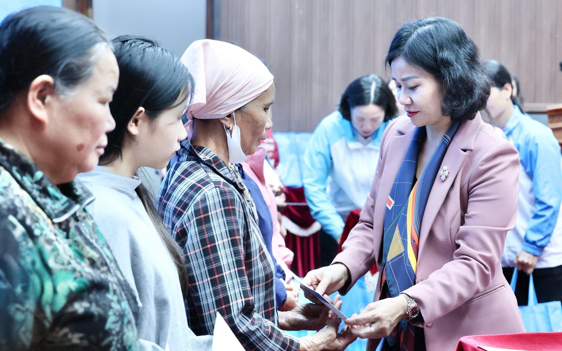 Ủy viên TƯ Đảng, Phó Chủ tịch UBTƯ MTTQ Việt Nam, Chủ tịch Hội LHPN Việt Nam Nguyễn Thị Tuyến (bên phải) trao quà cho phụ nữ có hoàn cảnh khó khăn