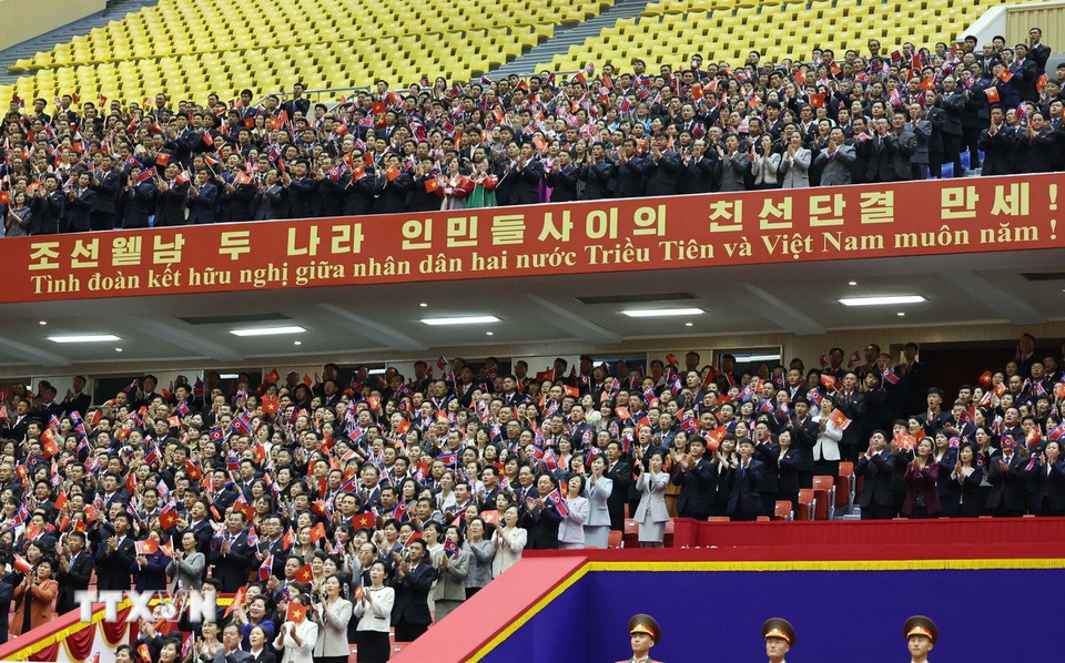 Quần chúng nhân dân Triều Tiên tham dự Lễ đón trọng thể Tổng Bí thư Tô Lâm và Đoàn đại biểu cấp cao Việt Nam thăm cấp Nhà nước tới Triều Tiên. (Ảnh: Thống Nhất/TTXVN)