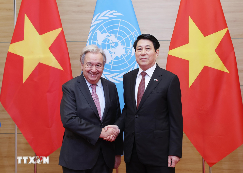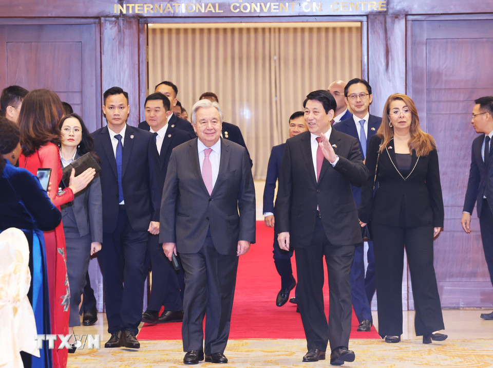 Chủ tịch nước Lương Cường đón Tổng Thư ký Liên hợp quốc António Guterres dự tiệc chiêu đãi. (Ảnh: Lâm Khánh/TTXVN)