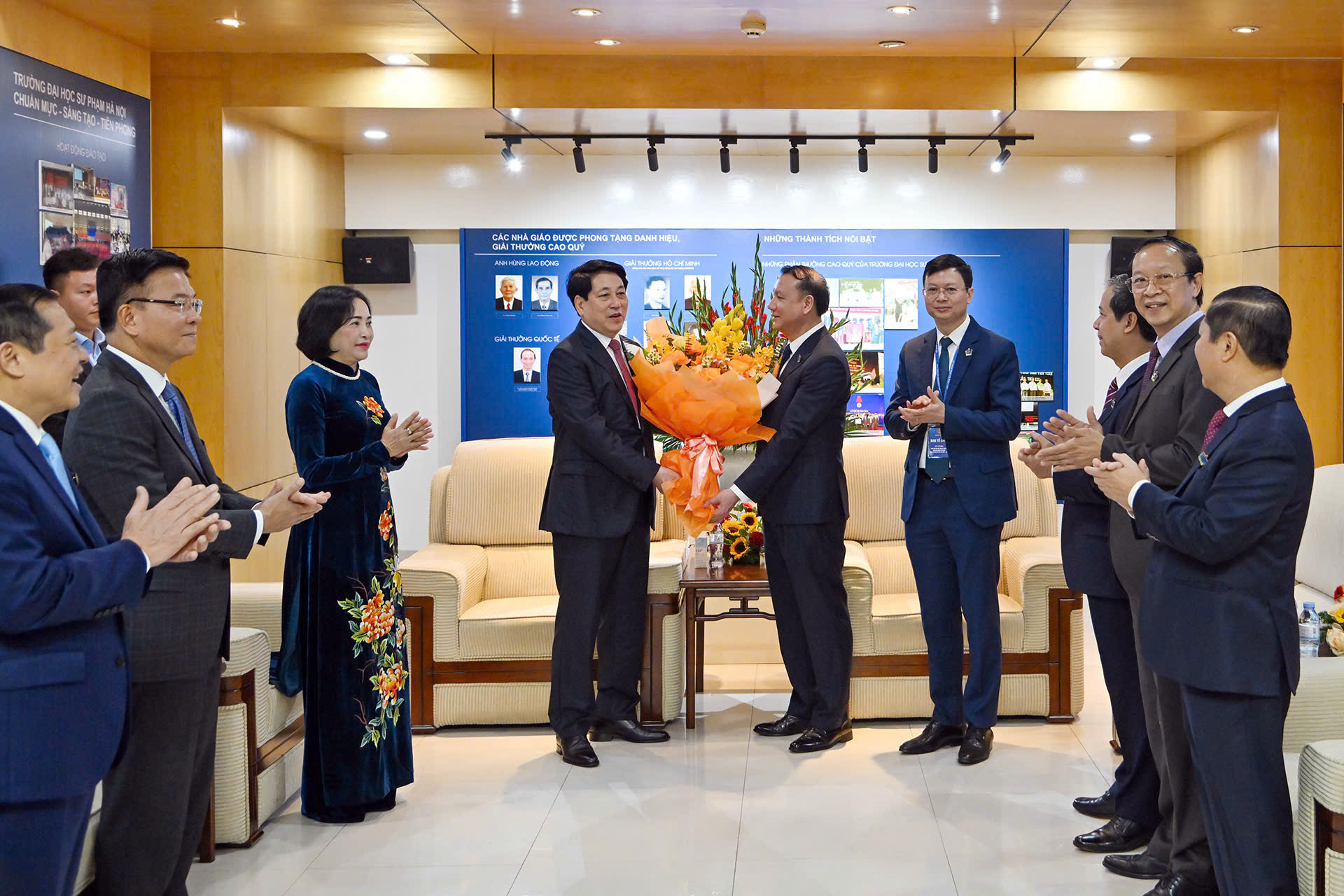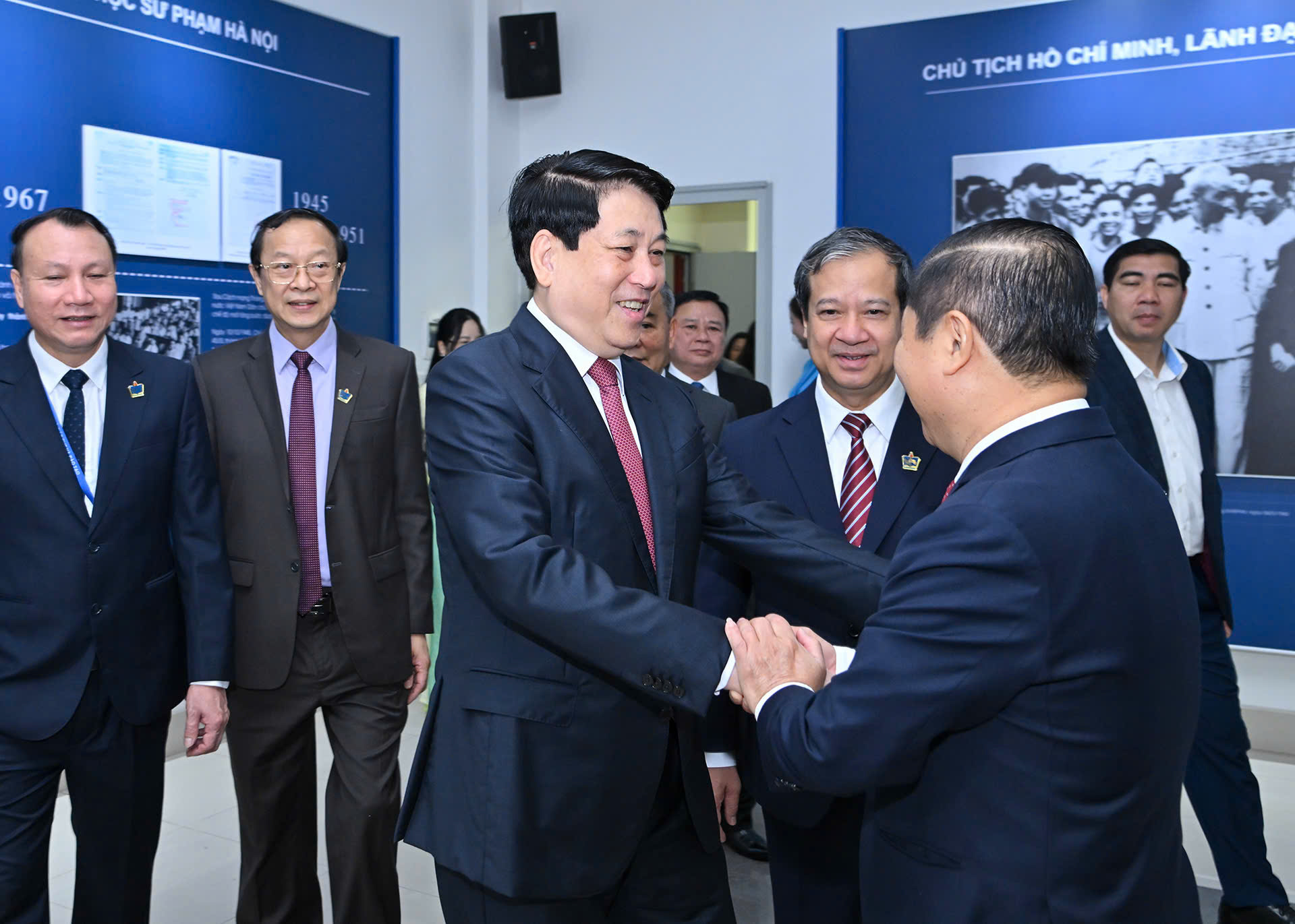 Lãnh đạo Bộ Giáo dục và Đào tạo, Trường Đại học Sư phạm Hà Nội đón Chủ tịch nước Lương Cường và các đại biểu dự buổi lễ.