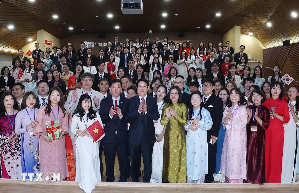 Chủ tịch nước Lương Cường với Cộng đồng người Việt Nam tại Đông Nam Hàn Quốc. (Ảnh: Lâm Khánh/TTXVN)
