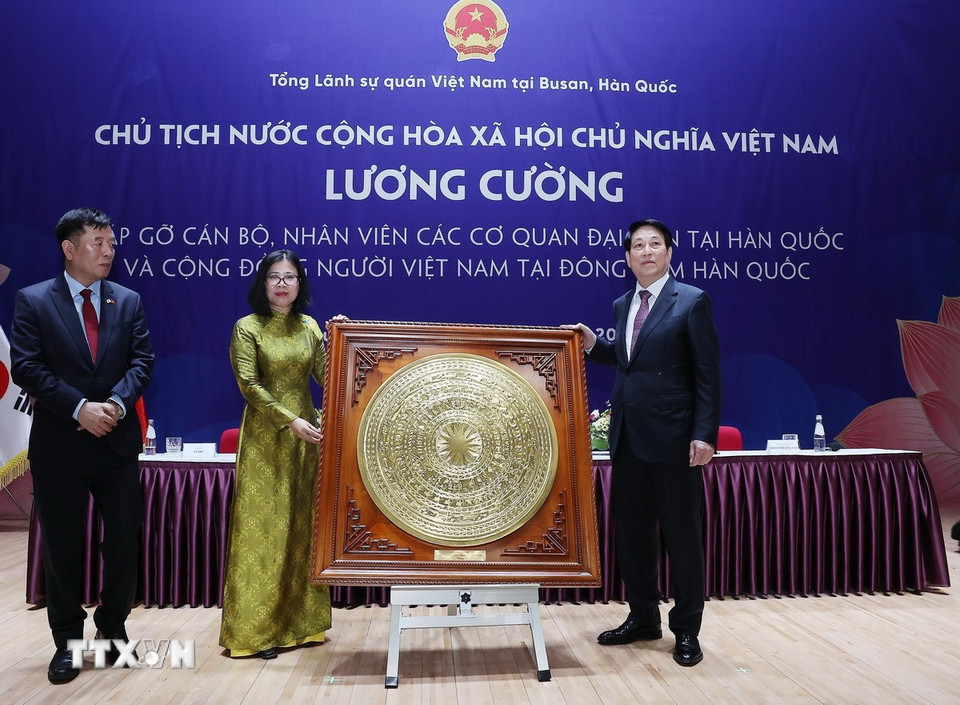 Chủ tịch nước Lương Cường với cán bộ, nhân viên các cơ quan đại diện Việt Nam tại Hàn Quốc và Cộng đồng người Việt Nam tại Đông Nam Hàn Quốc. (Ảnh: Lâm Khánh/TTXVN)