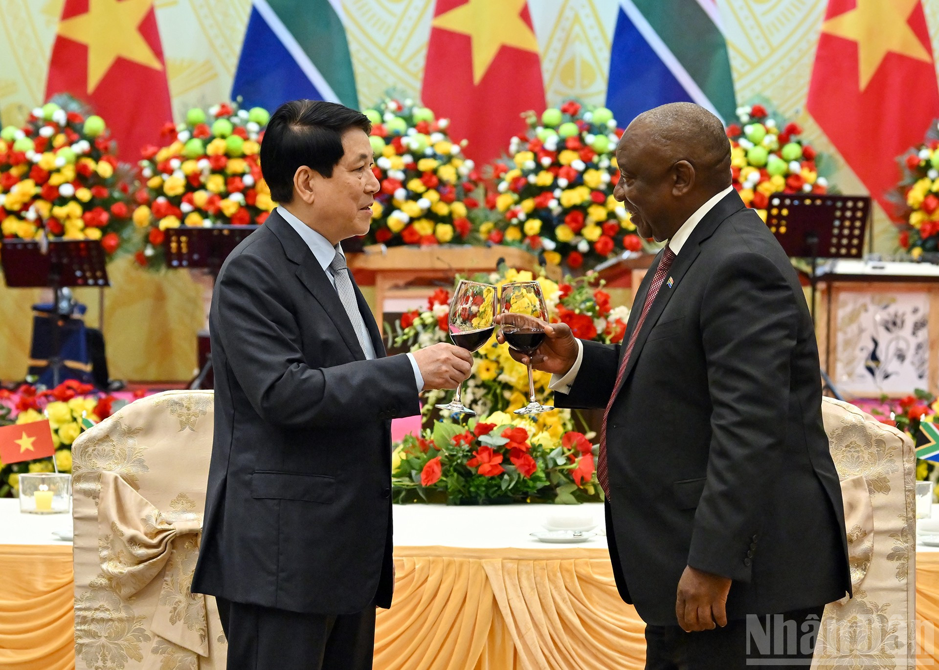 Chủ tịch nước Lương Cường và Tổng thống Nam Phi Matamela Cyril Ramaphosa cùng nâng ly tại chiêu đãi.