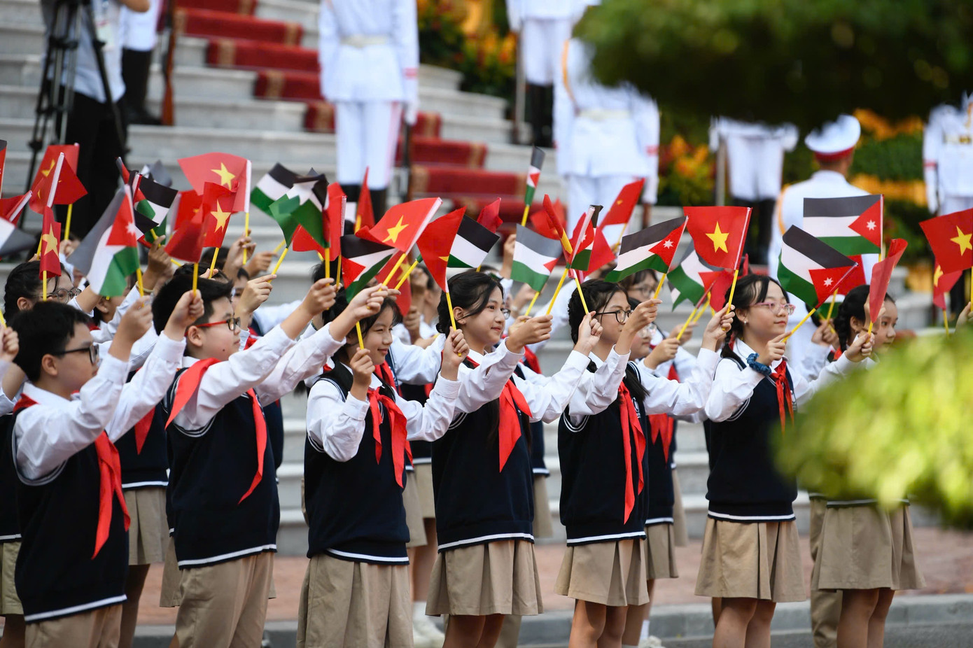 Các cháu thiếu nhi Hà Nội chào mừng Quốc vương Jordan Abdullah II Ibn Al Hussein thăm chính thức Việt Nam. Ảnh: Như Ý.