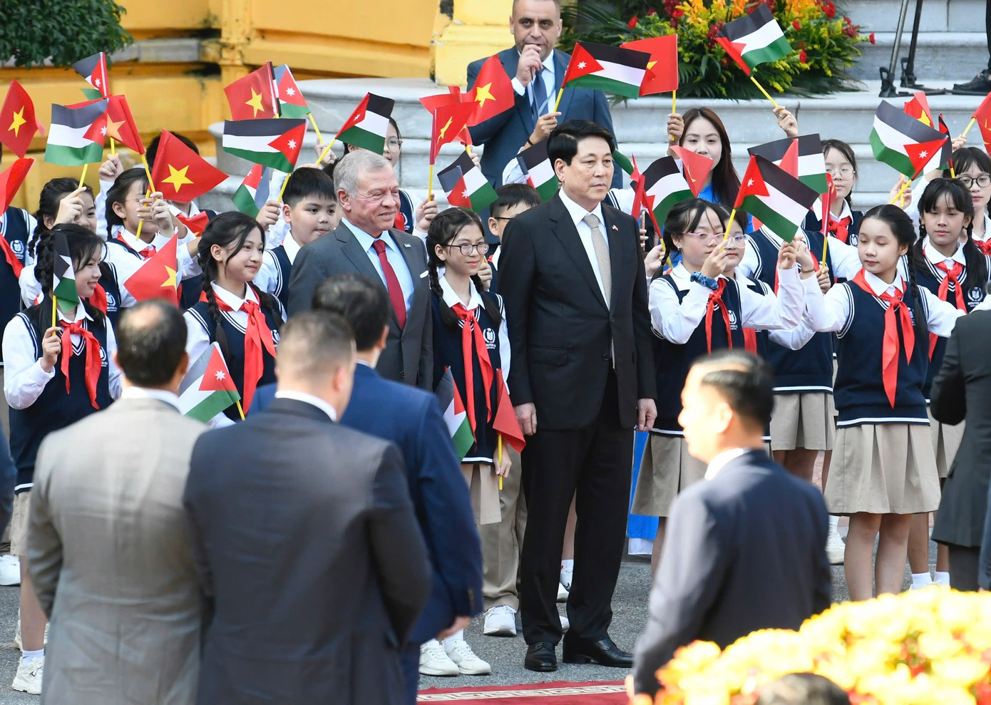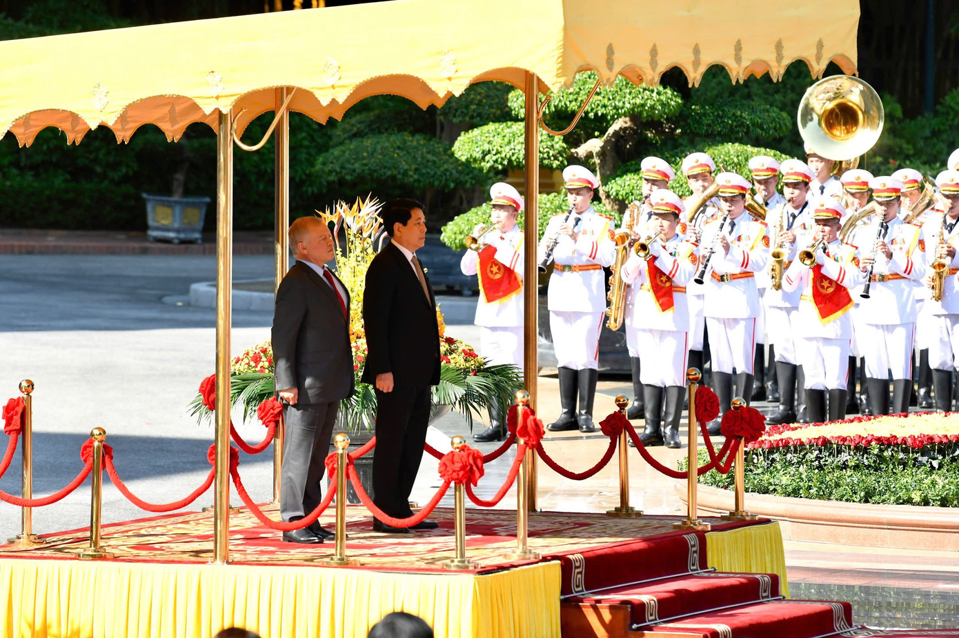 Chủ tịch nước Lương Cường chủ trì lễ đón chính thức Quốc vương Jordan Abdullah II Ibn Al Hussein. Đây là chuyến thăm đầu tiên của người đứng đầu Vương quốc Jordan đến Việt Nam. Ảnh: Như Ý.