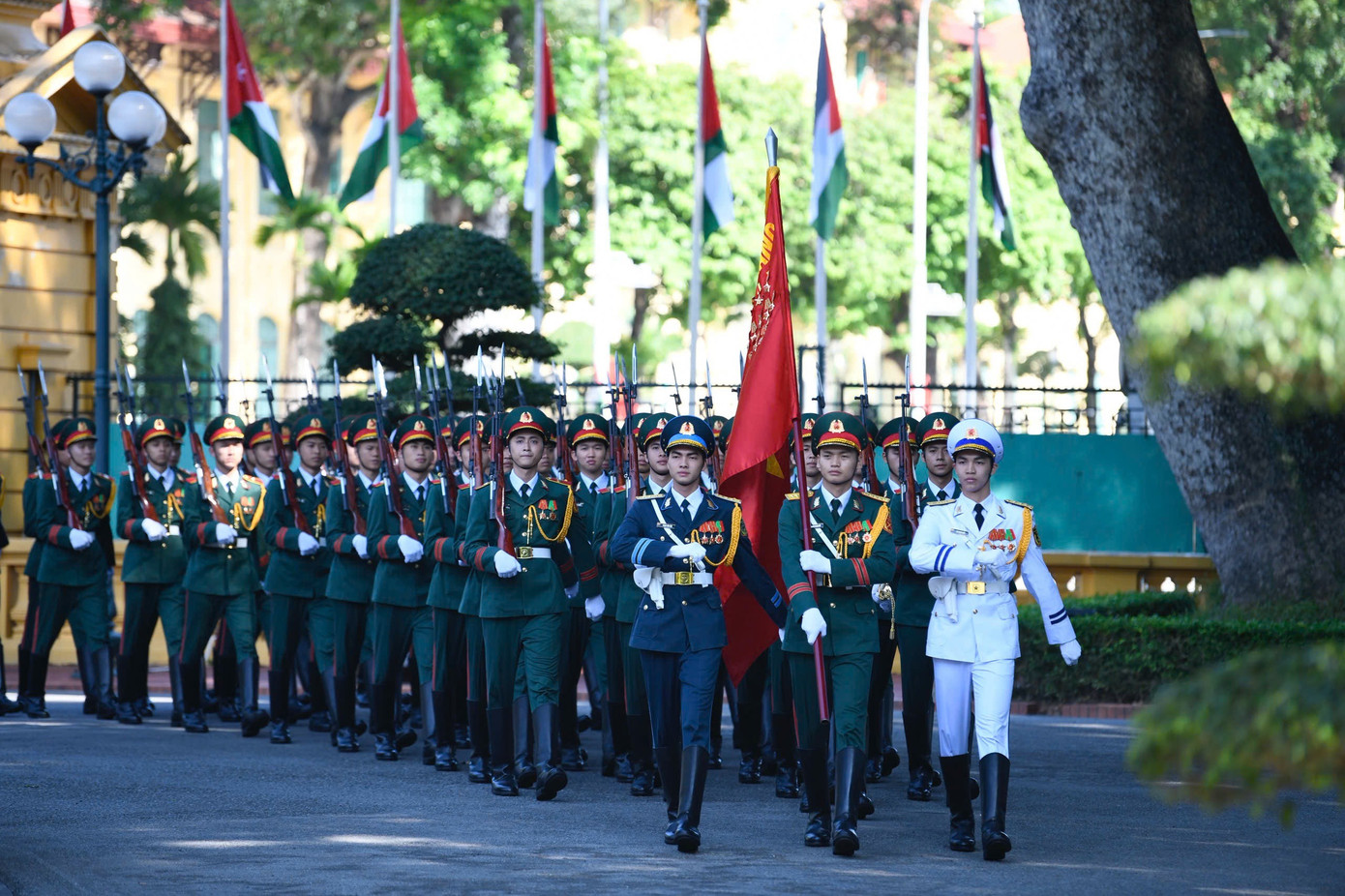 Đội danh dự thực hiện nghi thức trang trọng tại lễ đón Quốc vương Jordan. Ảnh: Như Ý.