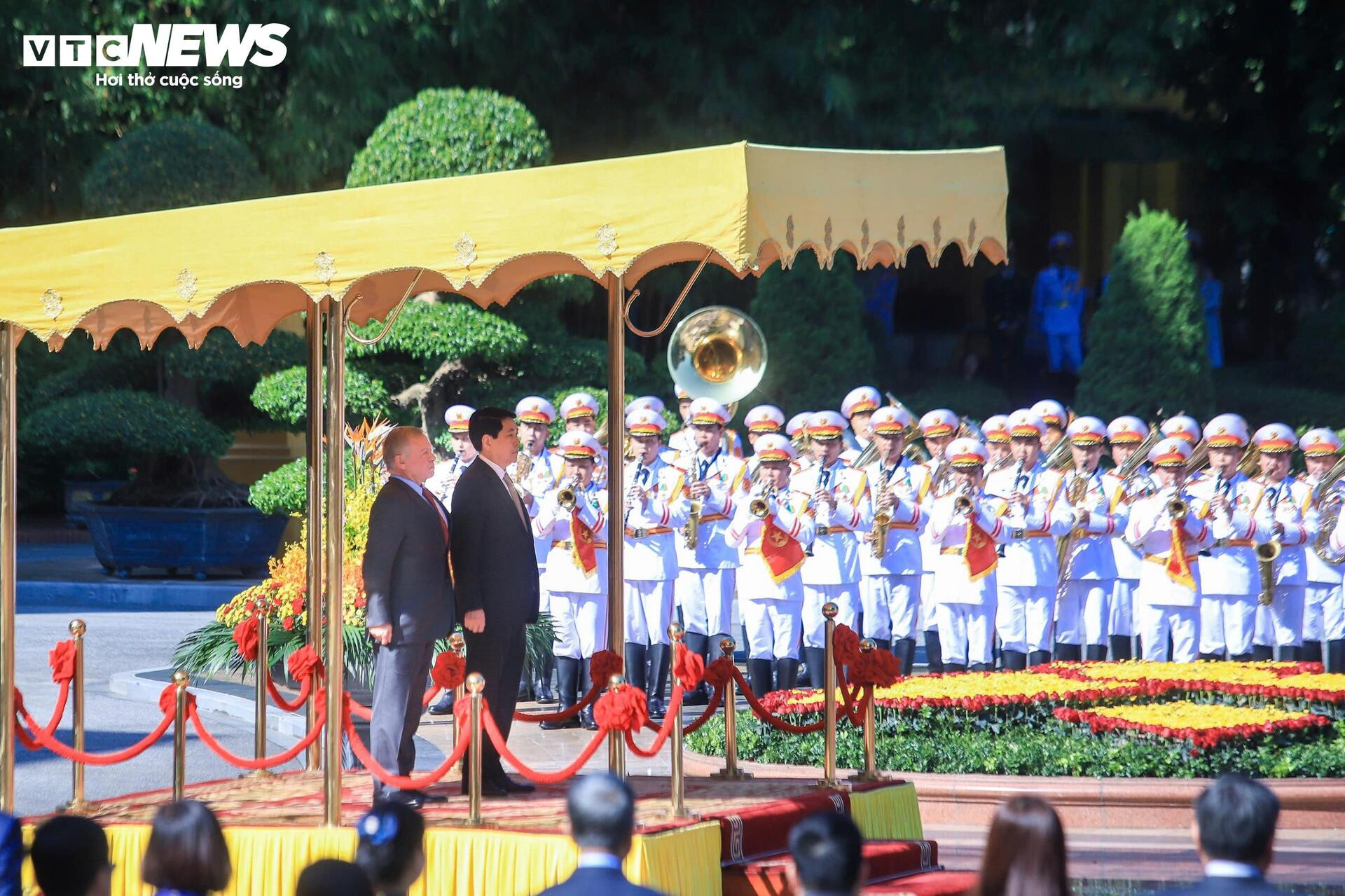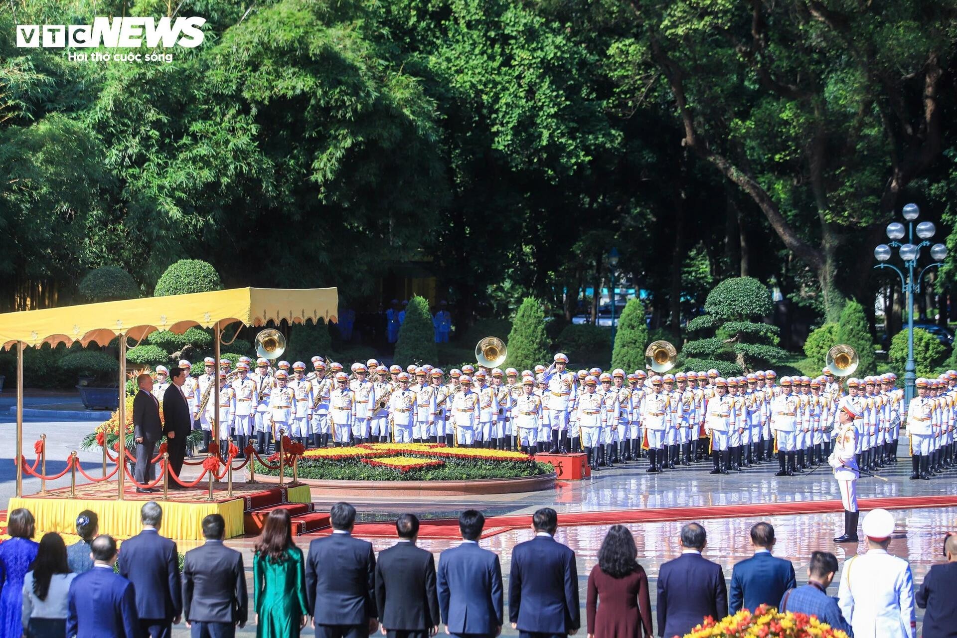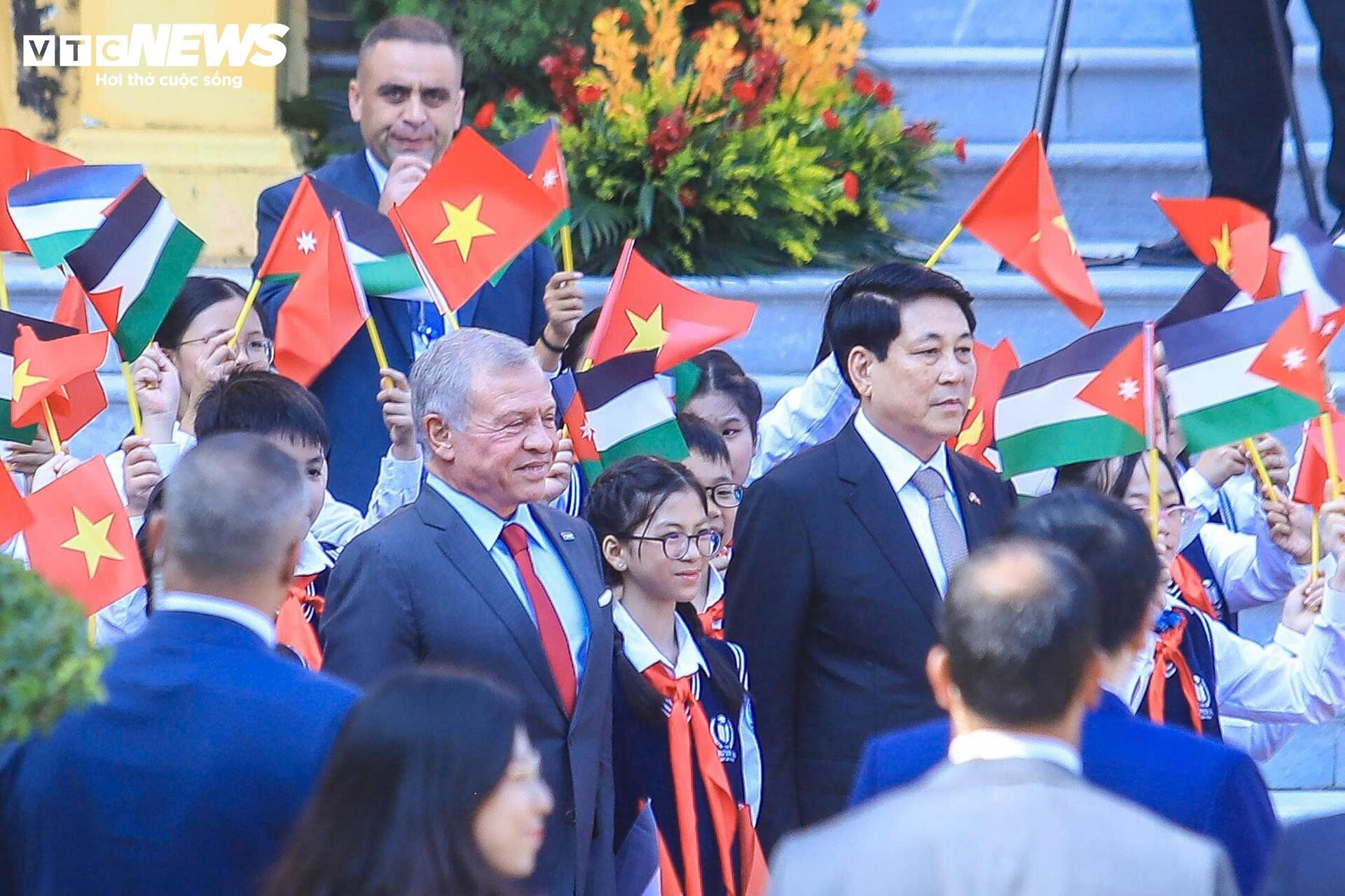 Chủ tịch nước Lương Cường và Quốc vương Vương quốc Hashemite Jordan Abdullah II Ibn Al Hussein đứng trên bục danh dự, Quân nhạc cử Quốc thiều hai nước.