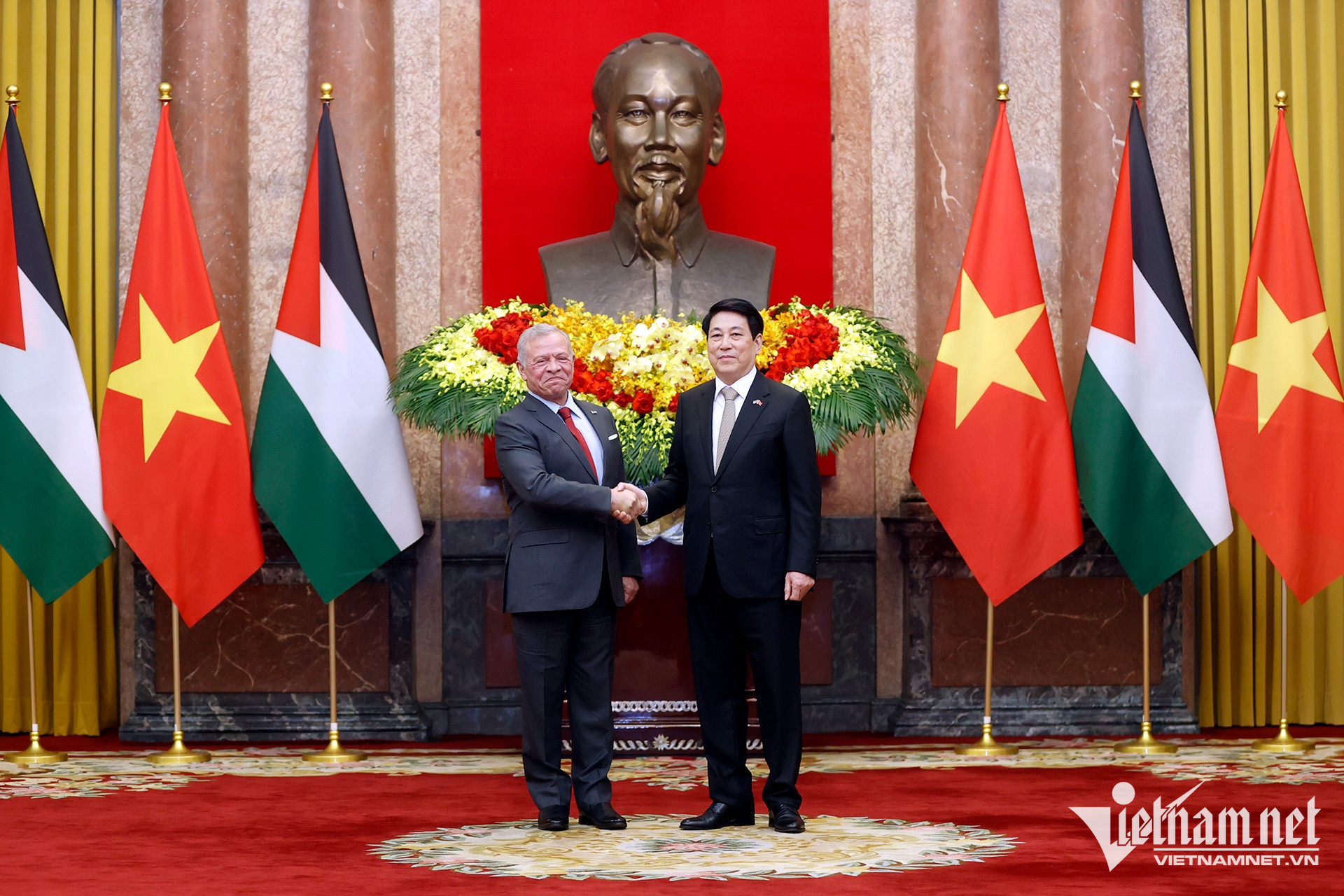 Trong tiếng nhạc chào mừng, Chủ tịch nước Lương Cường bắt tay, chào đón Quốc vương Jordan thăm Việt Nam.