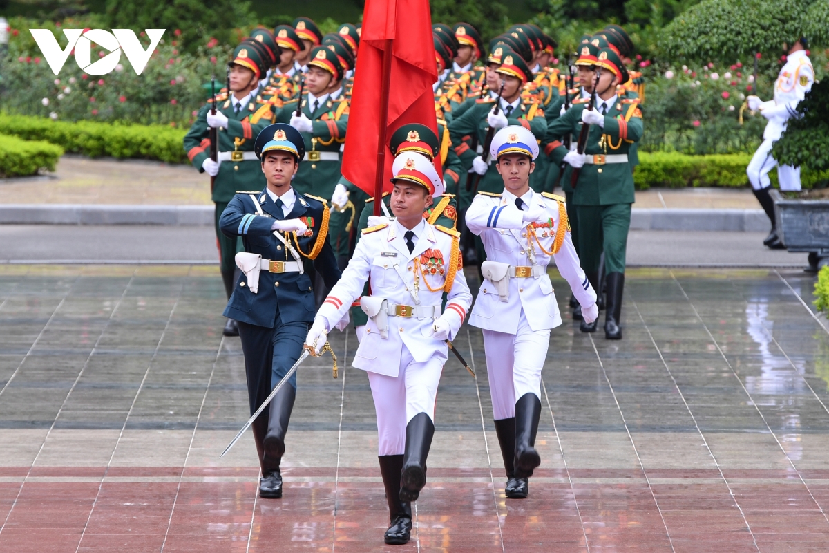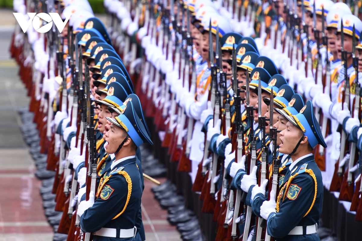 Đội trưởng đội danh dự Quân đội nhân dân Việt Nam chỉ huy đội hình diễu qua bục danh dự.