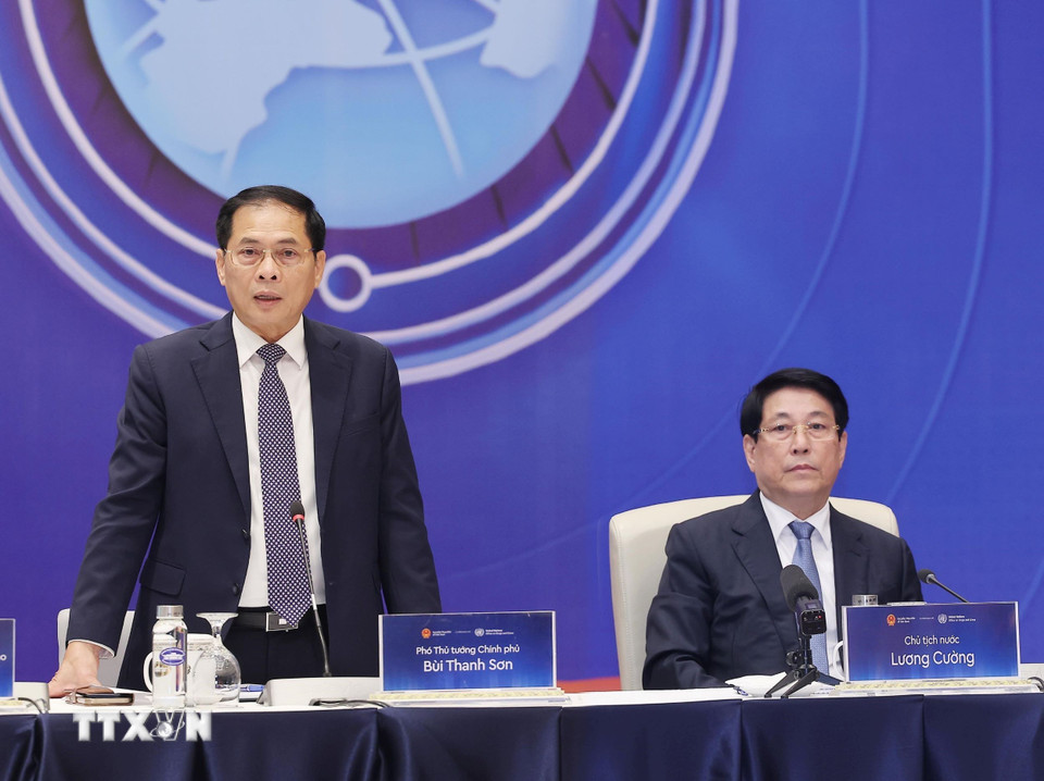 Phó Thủ tướng Bùi Thanh Sơn, Trưởng Ban chỉ đạo Lễ mở ký Công ước Liên hợp quốc về chống tội phạm mạng phát biểu. (Ảnh: Lâm Khánh/TTXVN)
