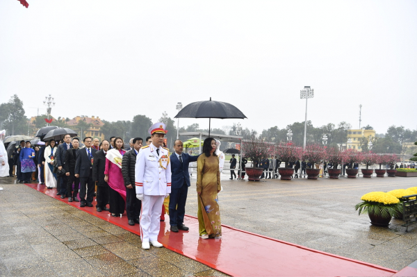 Thứ trưởng Bộ Ngoại giao Lê Thị Thu Hằng dẫn đầu đoàn kiều bào tiêu biểu vào Lăng viếng Chủ tịch Hồ Chí Minh.