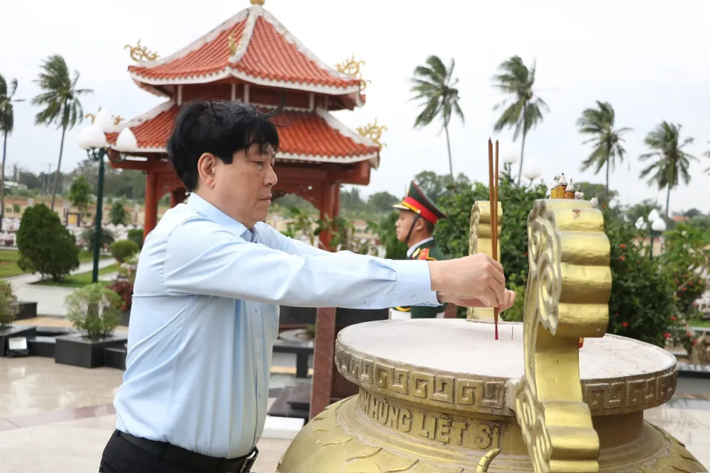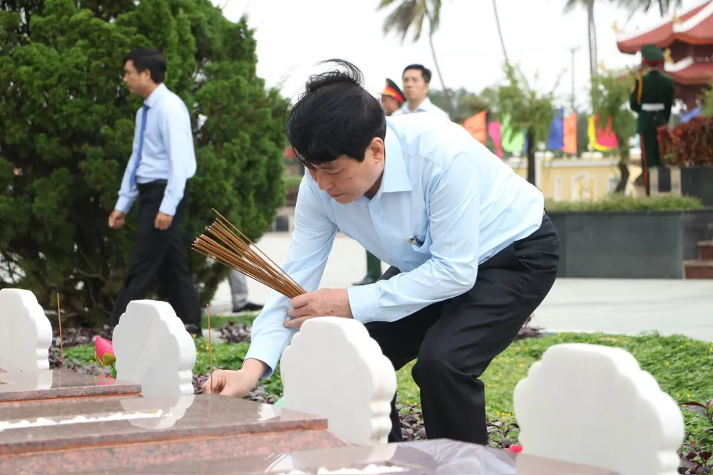 Chủ tịch nước Lương Cường cùng lãnh đạo Quốc hội, Chính phủ dâng hoa, dâng hương tại nghĩa trang liệt sĩ Điện Bàn. Ảnh: DNRT