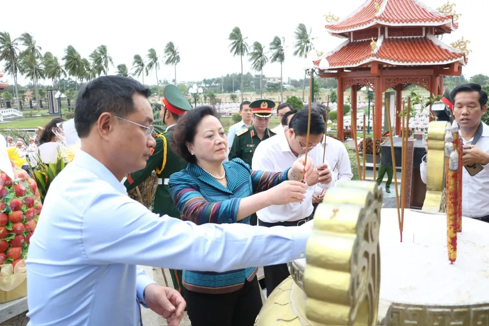 Chủ tịch nước Lương Cường cùng lãnh đạo Quốc hội, Chính phủ tại nghĩa trang liệt sĩ Điện Bàn. Ảnh: DNRT