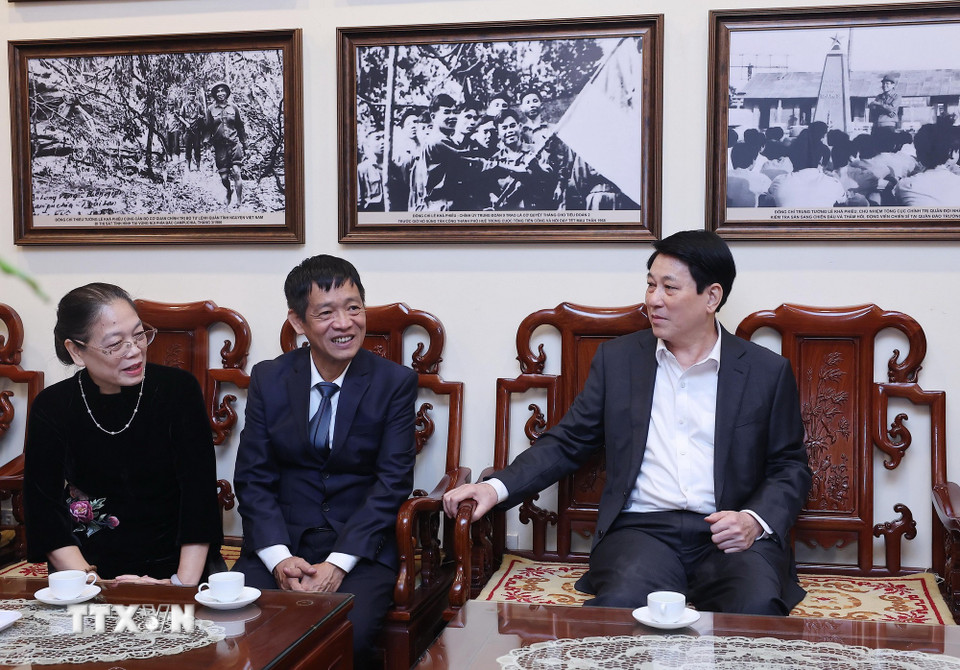Chủ tịch nước Lương Cường thăm hỏi, chúc Tết gia đình Tổng Bí thư Lê Khả Phiêu. (Ảnh: Lâm Khánh/TTXVN)