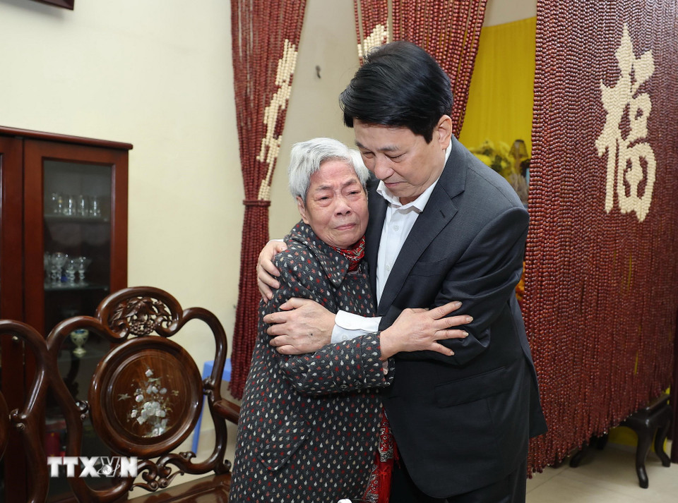 Chủ tịch nước Lương Cường thăm hỏi, động viên Phu nhân cố Chủ tịch nước Trần Đức Lương. (Ảnh: Lâm Khánh/TTXVN)