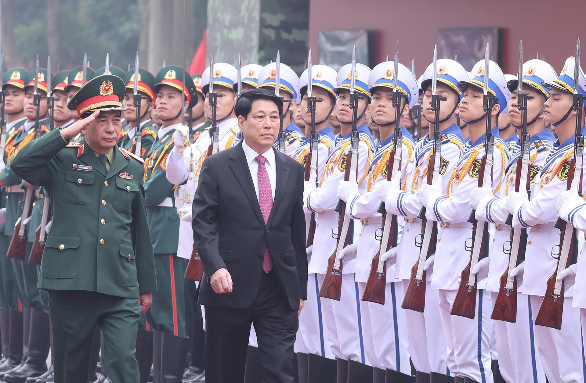 Đại tướng Phan Văn Giang, Bộ trưởng Quốc phòng đón Chủ tịch nước Lương Cường dự hội nghị. Ảnh: TTXVN