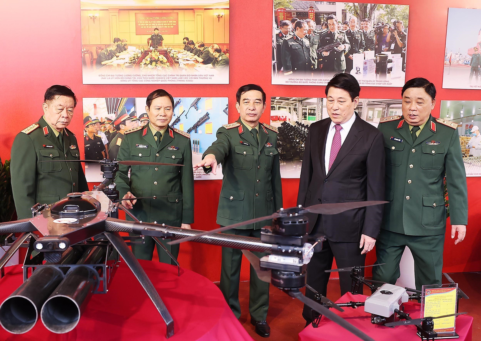 Chủ tịch nước Lương Cường và lãnh đạo Bộ Quốc phòng tham quan các gian trưng bày tại hội nghị. Ảnh: TTXVN