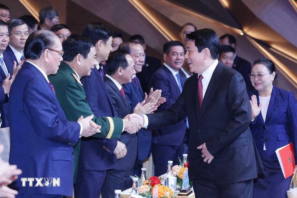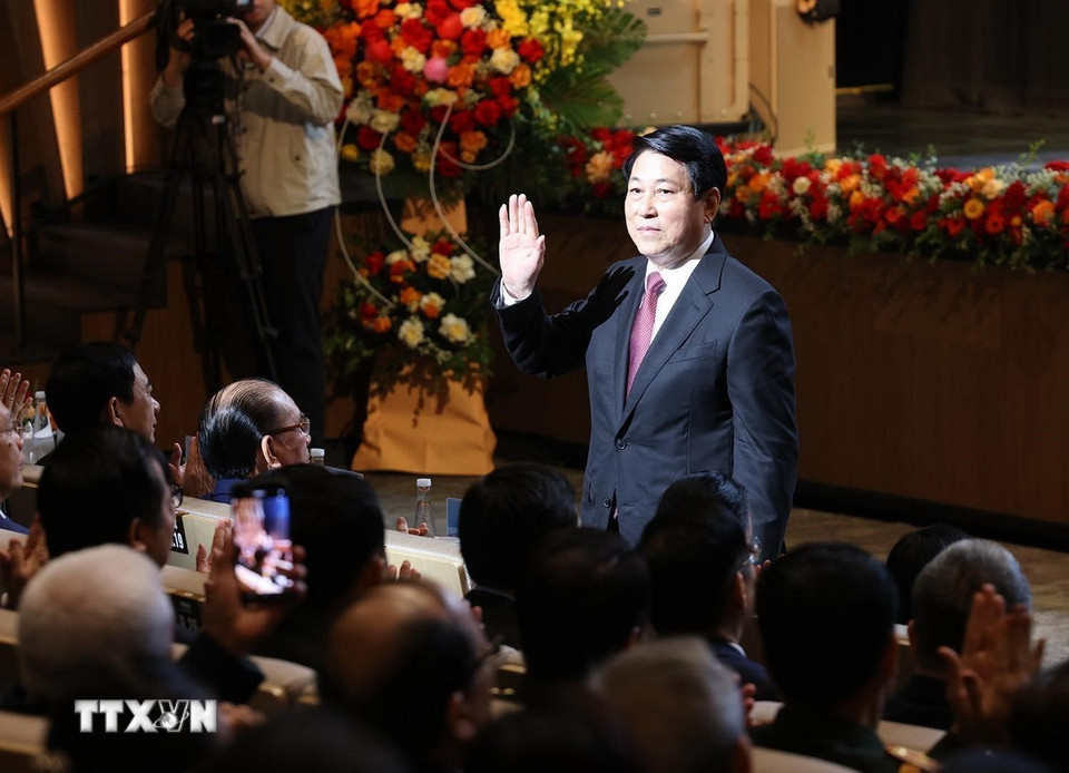 Chủ tịch nước Lương Cường và các đại biểu dự Lễ kỷ niệm 50 năm Quốc khánh nước Cộng hòa Dân chủ Nhân dân Lào (2/12/1975-2/12/2025) và 105 Ngày sinh Chủ tịch Kaysone Phonvihane. (Ảnh: Lâm Khánh/TTXVN)