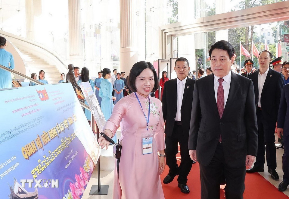 Chủ tịch nước Lương Cường tham quan trưng bày ảnh về quan hệ hữu nghị đặc biệt Việt Nam-Lào. (Ảnh: Lâm Khánh/TTXVN)