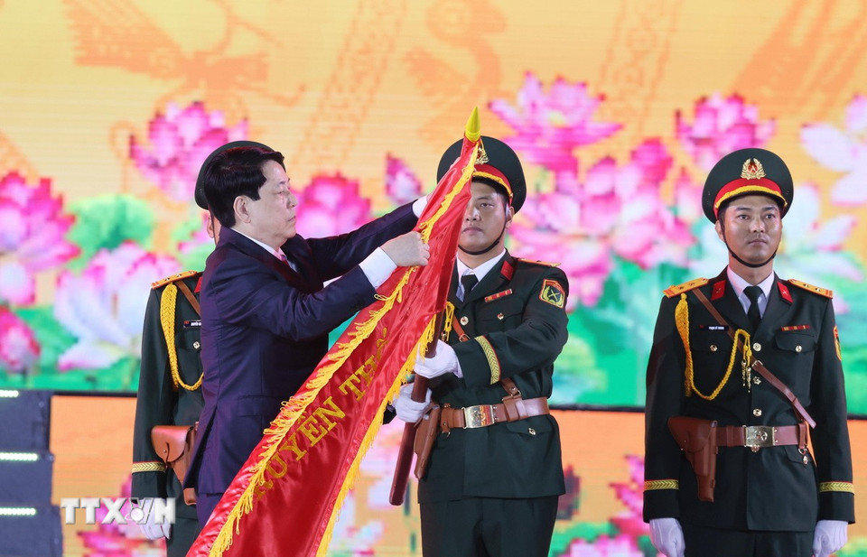 Chủ tịch nước Lương Cường trao danh hiệu Thành phố Anh hùng cho Đảng bộ, chính quyền và nhân dân Thành phố Hải Phòng. (Ảnh: Lâm Khánh/TTXVN)