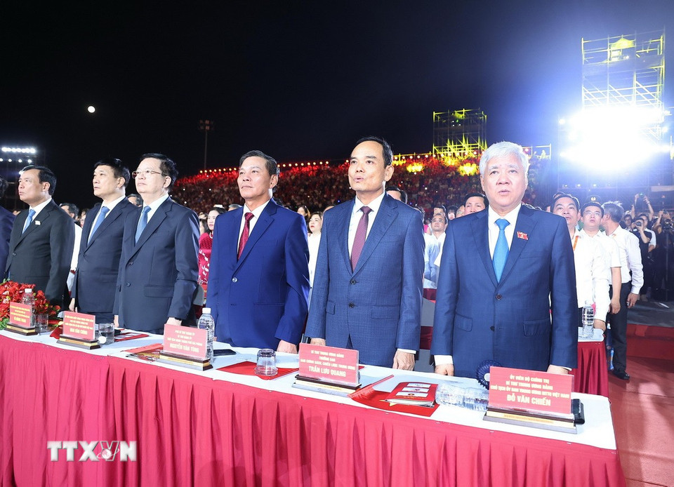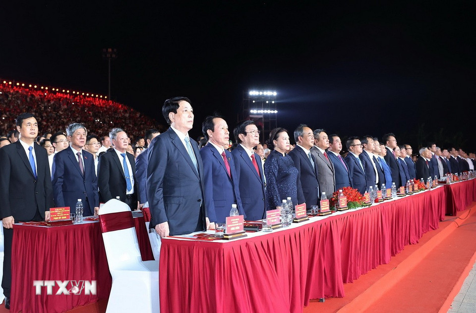 Lãnh đạo, nguyên lãnh đạo Đảng, Nhà nước và các đại biểu dự lễ kỷ niệm 70 năm Ngày giải phóng Hải Phòng (13/5/1955-13/5/2025). (Ảnh: Lâm Khánh/TTXVN)