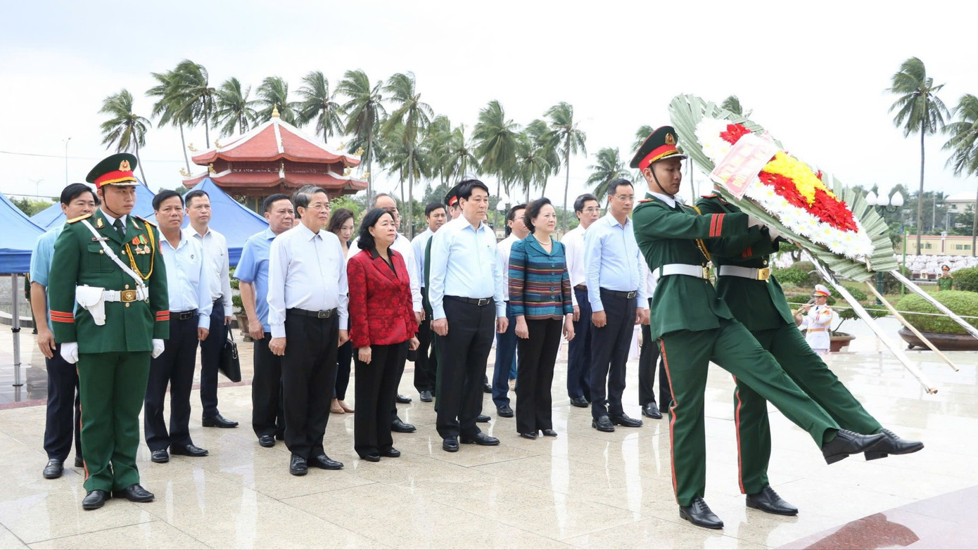 Sáng cùng ngày, Chủ tịch nước Lương Cường cùng đoàn công tác đã đến dâng hương các Anh hùng liệt sĩ tại Nghĩa trang liệt sĩ Điện Bàn.