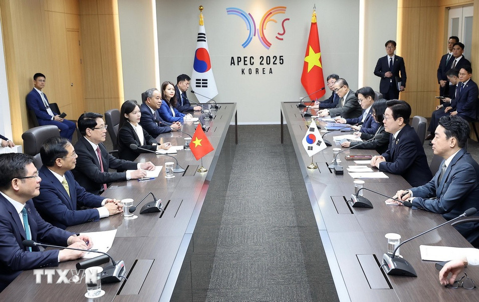 Chủ tịch nước Lương Cường hội đàm với Tổng thống Hàn Quốc Lee Jae Myung. (Ảnh: Lâm Khánh/TTXVN)
