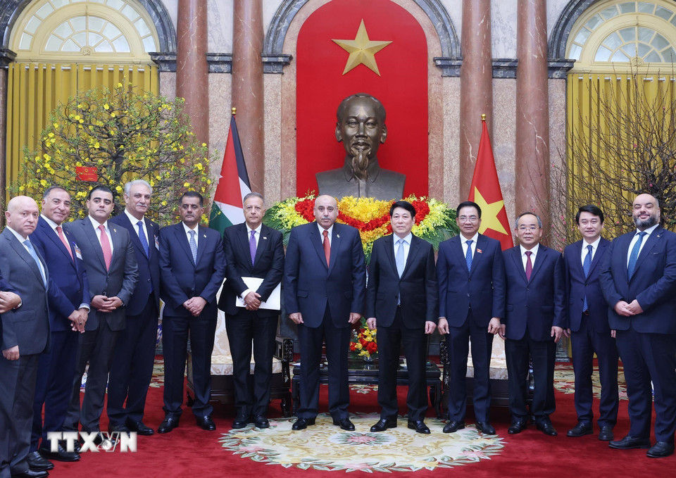 Chủ tịch nước Lương Cường với Chủ tịch Hạ viện Vương quốc Hashemite Jordan Mazen Turki El Qadi và các đại biểu. (Ảnh: Lâm Khánh/TTXVN)