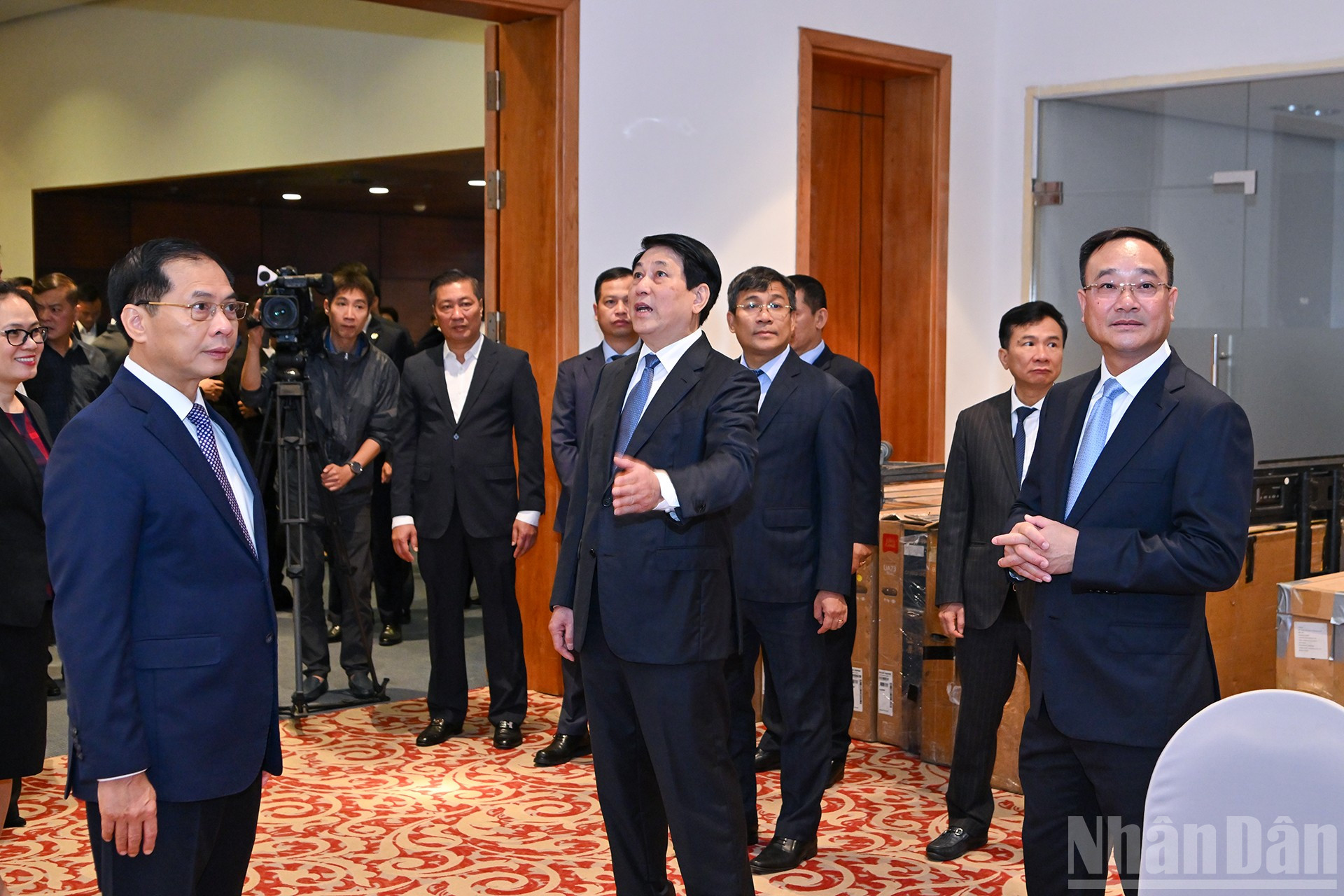 Chủ tịch nước Lương Cường, Phó Thủ tướng Bùi Thanh Sơn cùng các đại biểu tới kiểm tra buổi tổng duyệt chuẩn bị cho Lễ mở ký và Hội nghị cấp cao Công ước Liên hợp quốc về chống tội phạm mạng.
