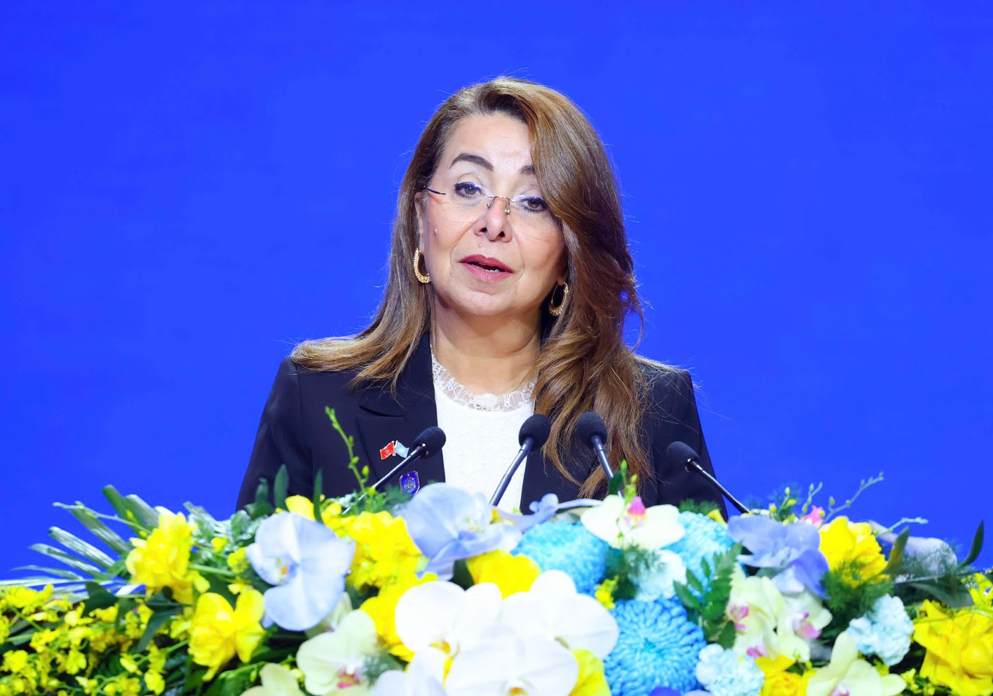 Bà Ghada Waly - Phó Tổng Thư ký LHQ, Giám đốc điều hành Cơ quan Phòng, chống ma túy và tội phạm LHQ (UNODC) kiêm Giám đốc Văn phòng LHQ tại Vienna (UNOV), phát biểu tại sự kiện. Ảnh: Như Ý