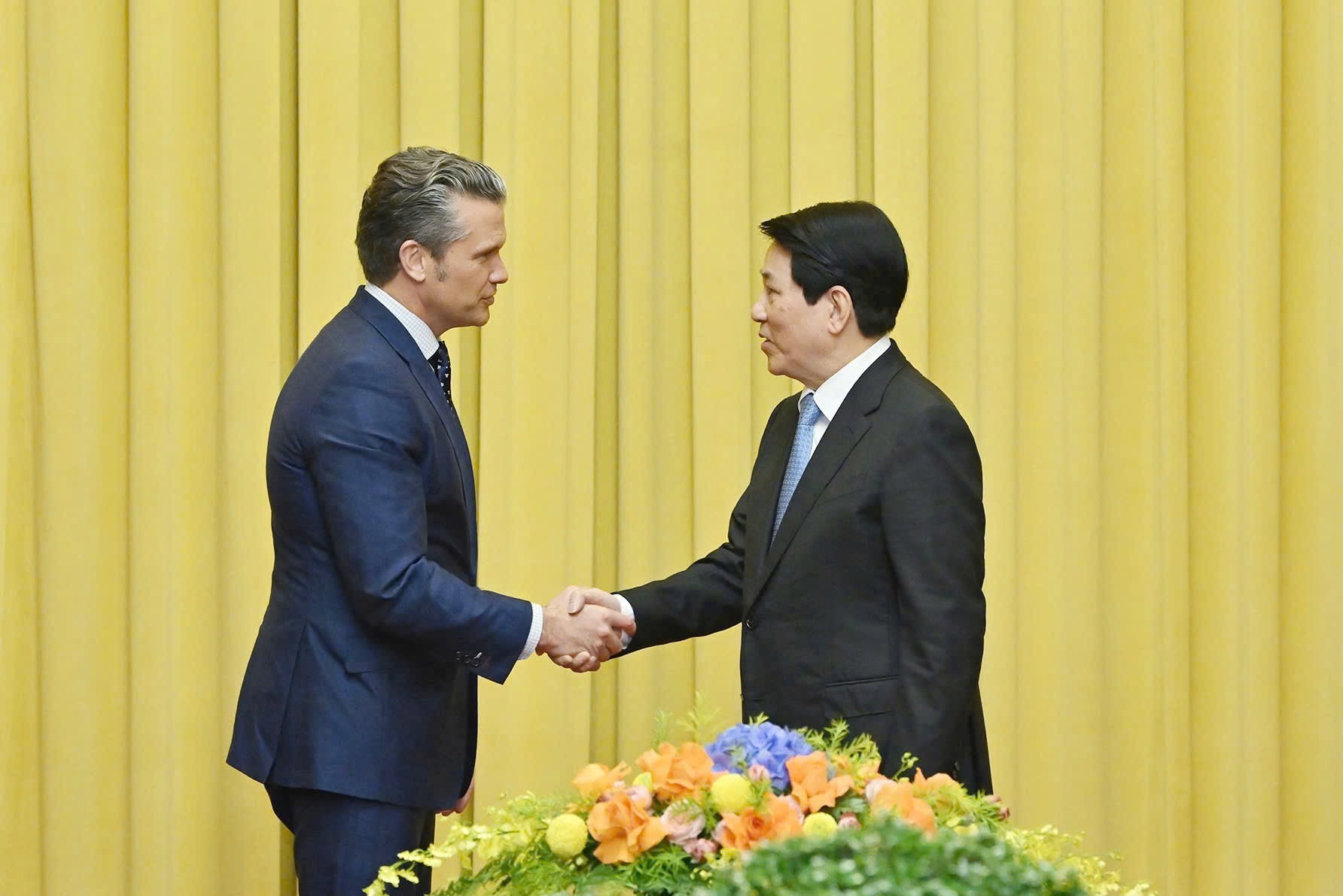 Chủ tịch nước Lương Cường tiếp Bộ trưởng Bộ Chiến tranh Hoa Kỳ Pete Hegseth. Ảnh: VIẾT CHUNG